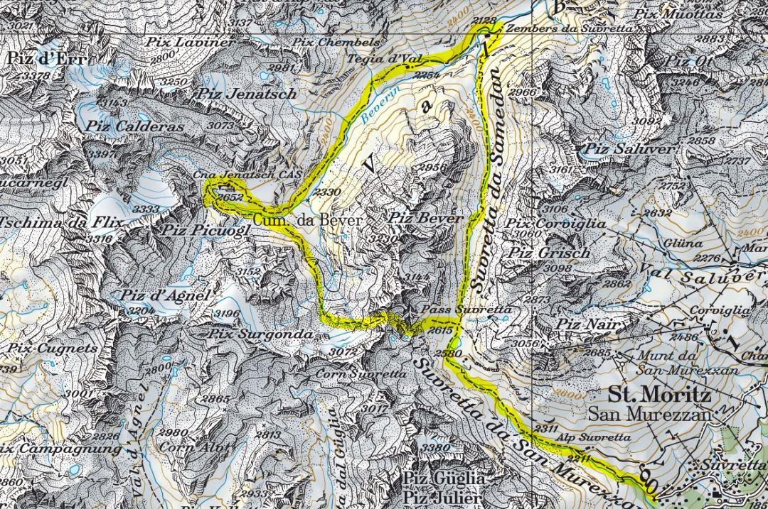 Suvretta-Futschöls (1995m) - Pass Suvretta (2613m) - Alp Suvretta (Val Bever) (2145m) - Jenatschhütte (2653m) - Fuorcla Suvretta (2966m) - Pass Suvretta (2613m) - Suvretta-Futschöls (1995m)
