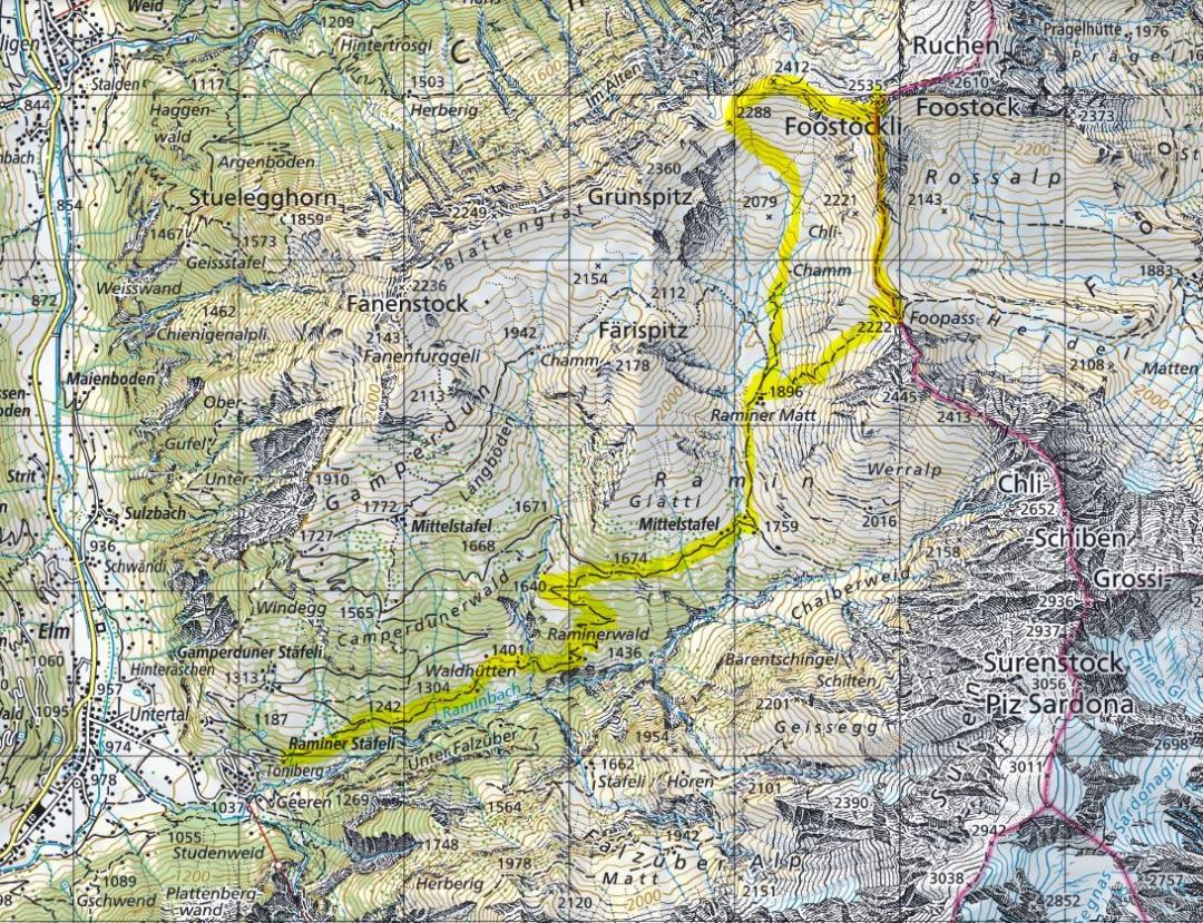 Elm-Raminer Stäfeli (1173m) - Raminer Matt (1896m) - Foopass (2222m) - Foostöckli (2535m) - Raminer Matt (1896m) - Elm-Raminer Stäfeli (1173m)