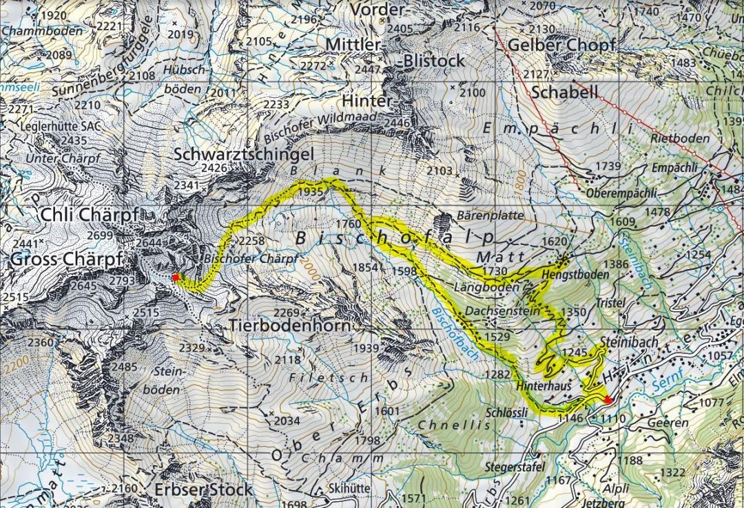 Elm-Steinibach (1111m) - Kleiner Fels im Schnee (2460m) / 200m unterhalb Chärpfscharte / 250m unterhalb Chli Chärpf - Elm-Steinibach(1111m)