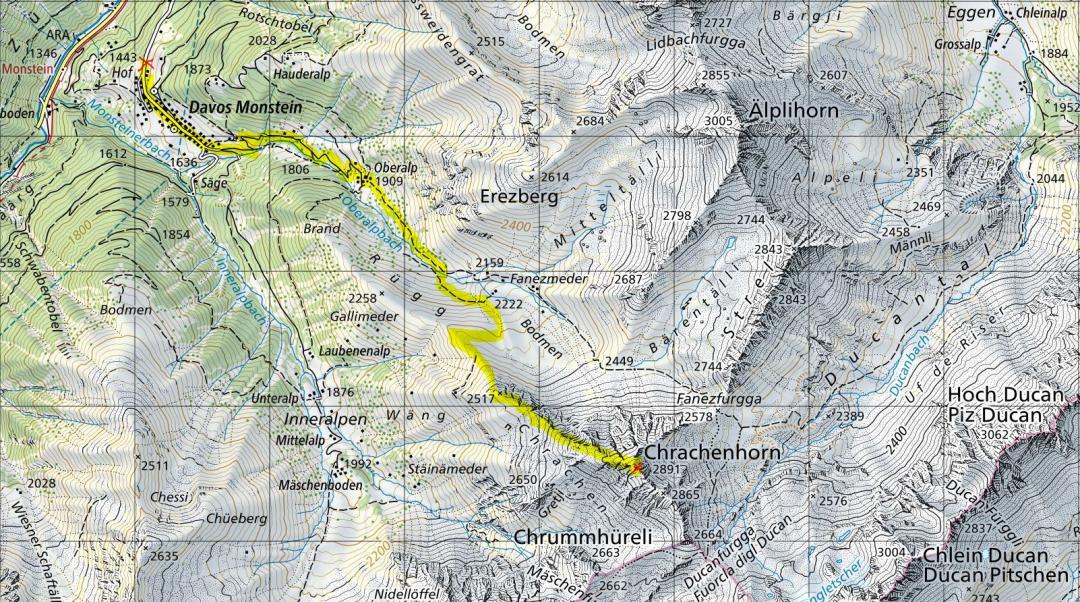 Davos Monstein (1580m) - Oberalp (1909m) - Chrachenhorn (2891m) - Oberalp (1909m) - Davos Monstein (1580m)