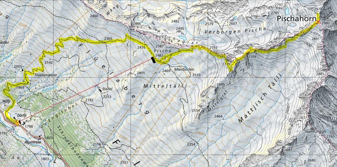 Davos Dörfji Talstation Pischabahn (1798m) - Bergstation Pischabahn (2482m) - Pischahorn (2980m) - Bergstation Pischabahn (2482m) - Davos Dörfji Talstation Pischabahn (1798m)