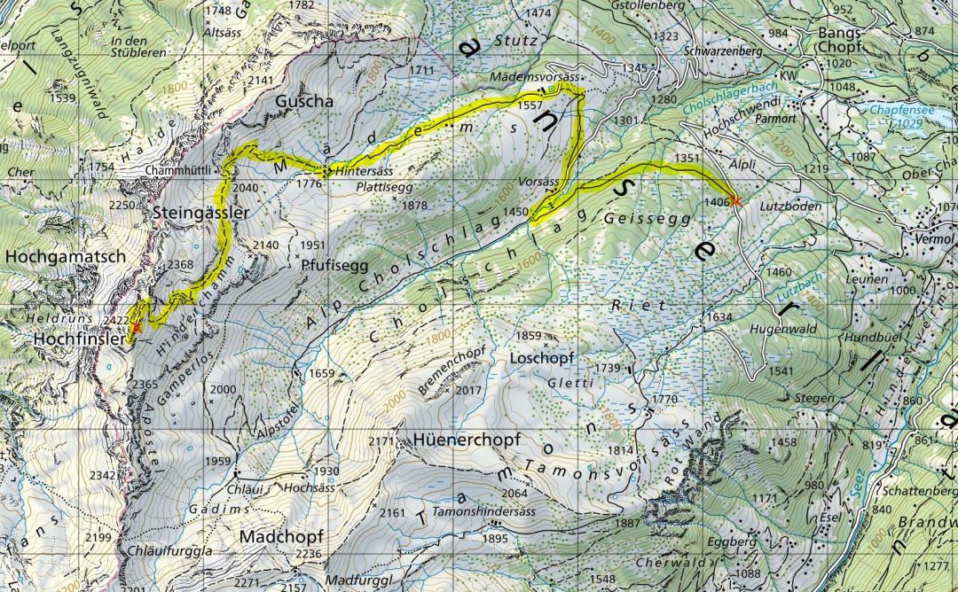 Mels-Vermol-Luggenböden (1406m) - Vorsäss (1451m) - Mädemsvorsäss (1557m) - Hintersäss (1776m) - Chammhüttli (2040m) - Hochfinsler (2422m) - Chammhüttli (2040m) - Hintersäss (1776m) - Mädemsvorsäss (1557m) - Vorsäss (1451m) - Mels-Vermol-Lüggenböden (1406m)