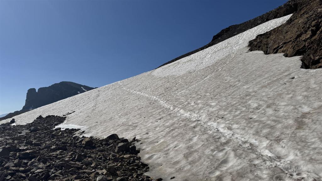 Über ein Schneefeld geht es auf den Grat (nahe Rotstocksattel) -