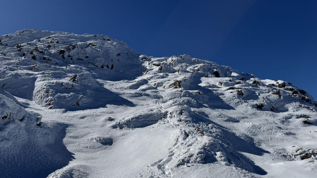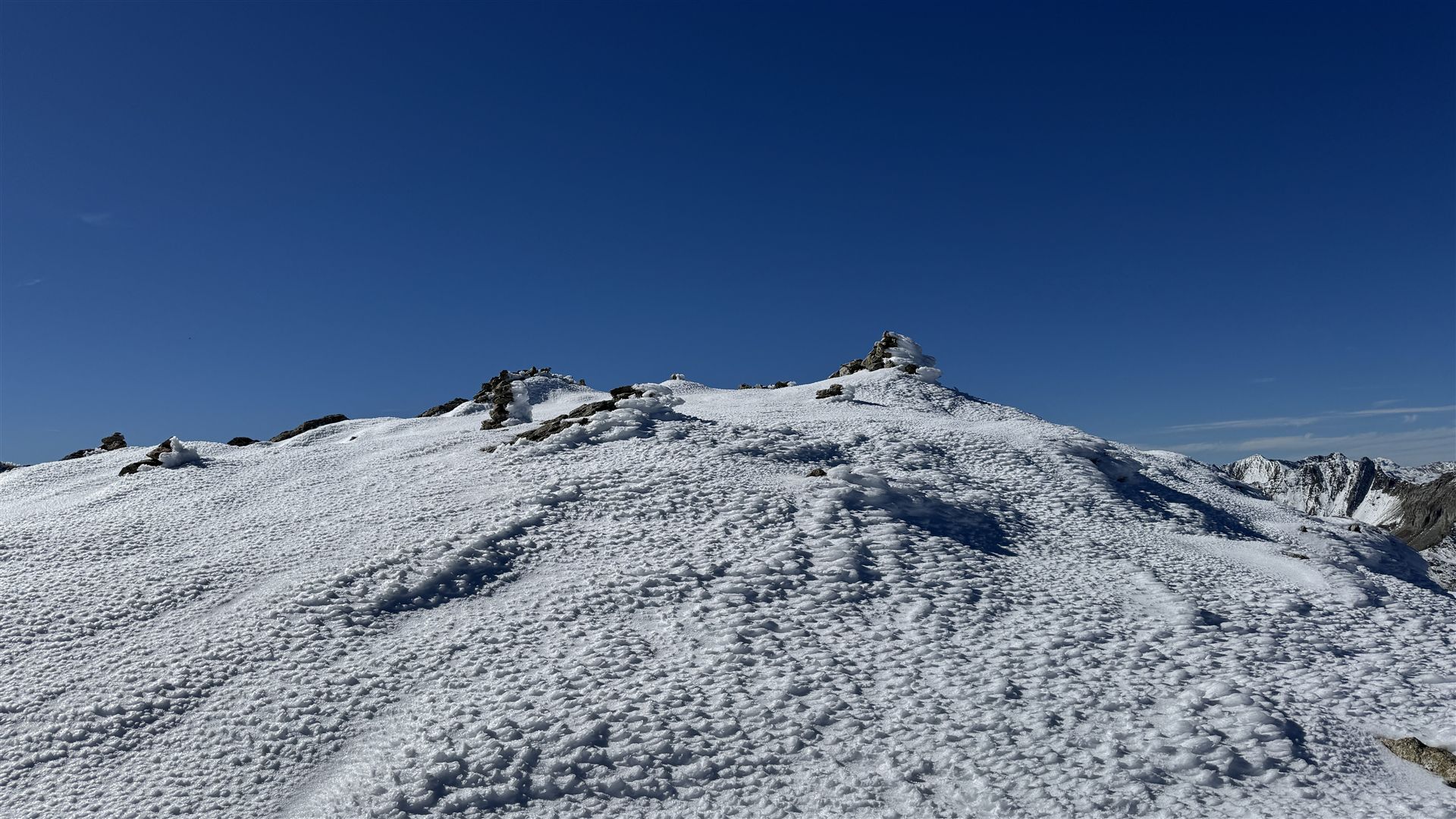 Mit den Bergschuhen kam ich gut auf den Gipfel, obwohl ich oft einsank. Die einzige vorhandene Fussspur benützte ich im Aufstieg nur ein Stück lang und suchte dann meinen eigenen Weg, der auch nicht besser war.