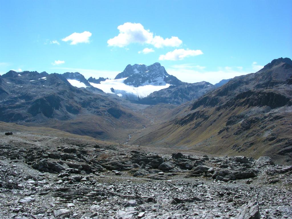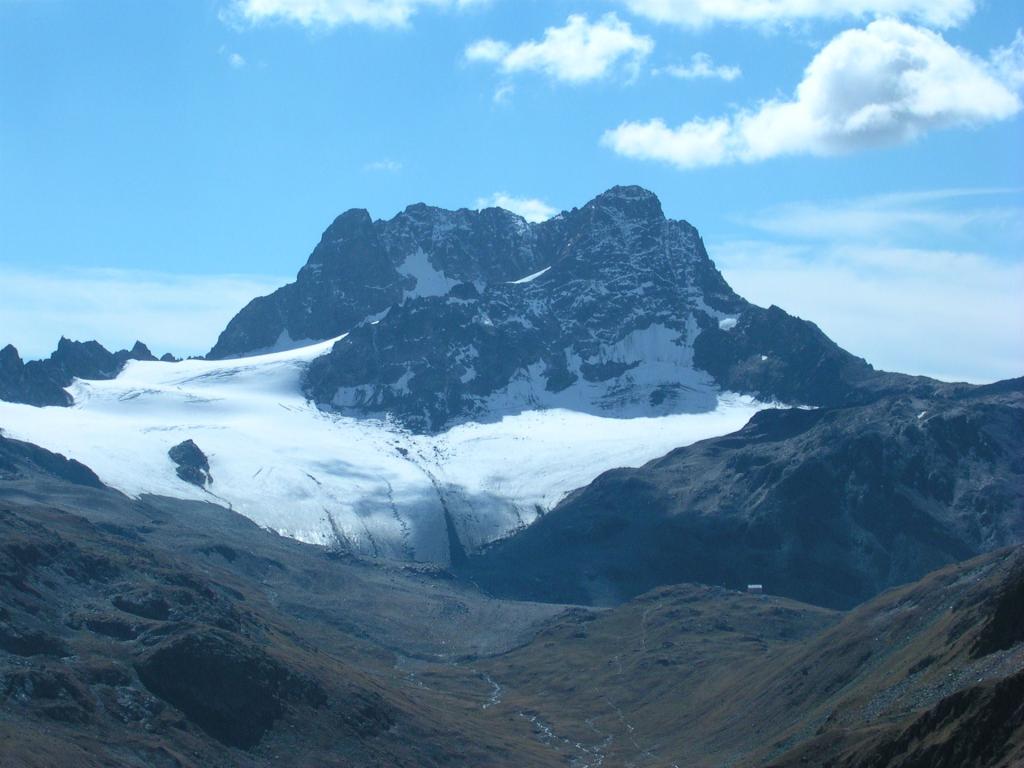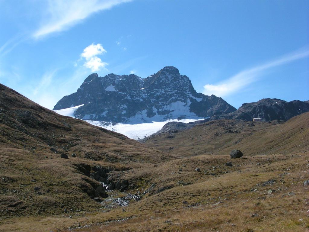 Auf dem Sertigpass, Blick mit Zoom auf Piz Kesch, Keschütte