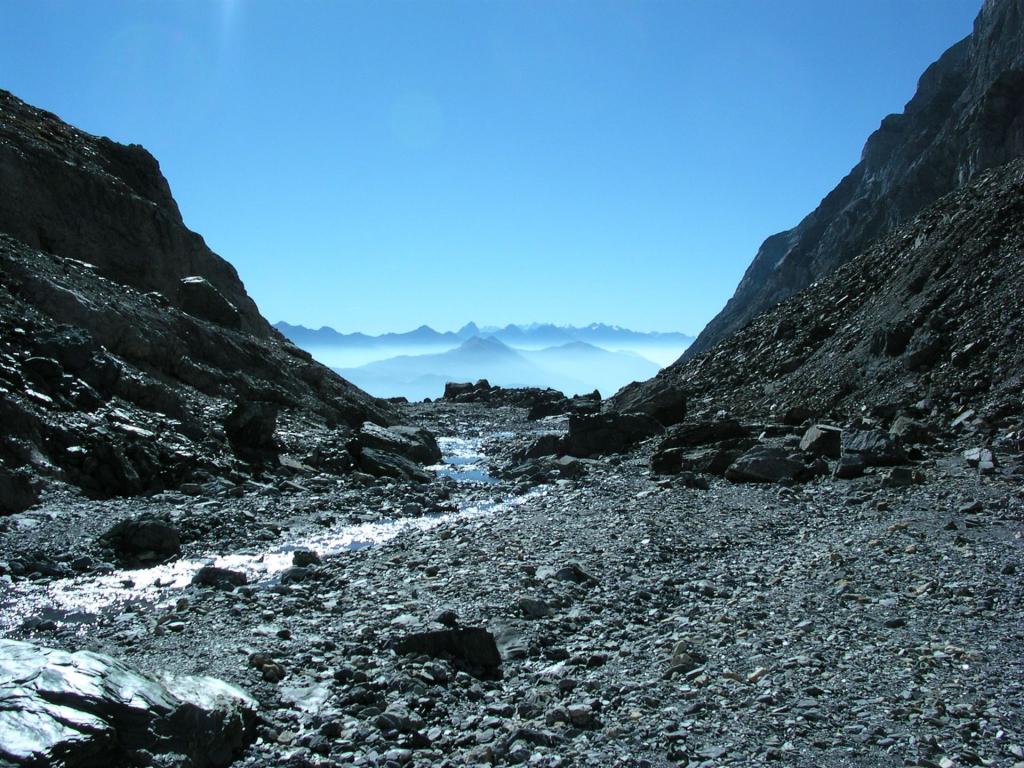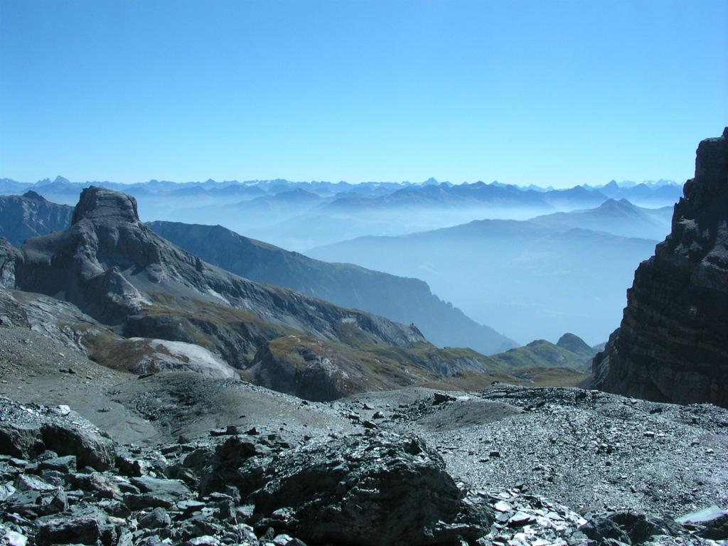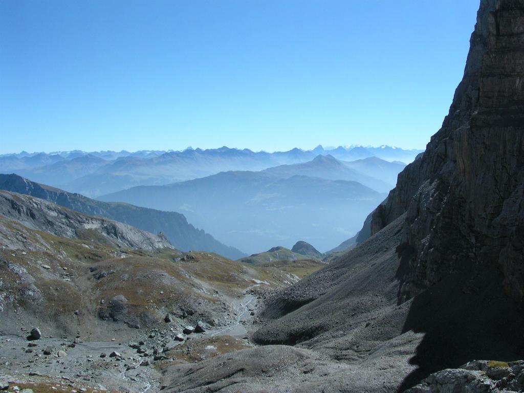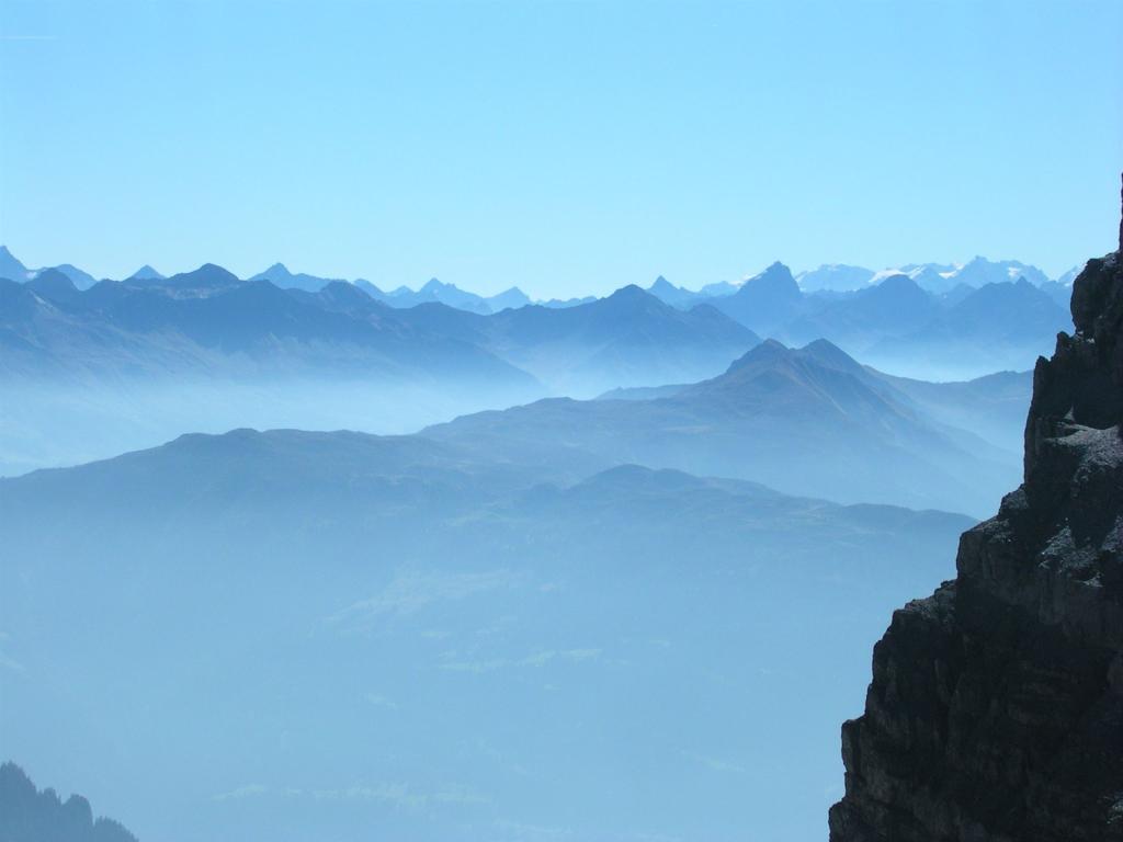 Am Wendepunkt, dunstiger Blick auf Bündner Berge