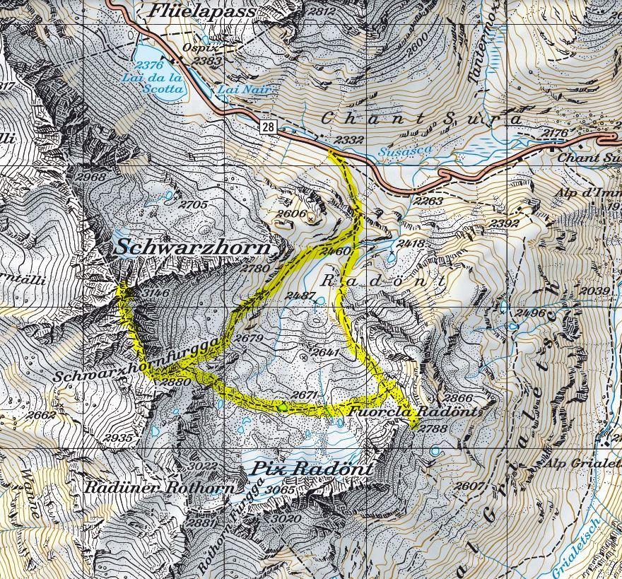 Flüelapass (2332m) - Schwarzhornfurgga (2880m) - Flüela Schwarzhorn (3146m) - Schwarzhornfurgga (2880m) - Fuorcla Radönt (2788m) - Flüelapass (2332m)