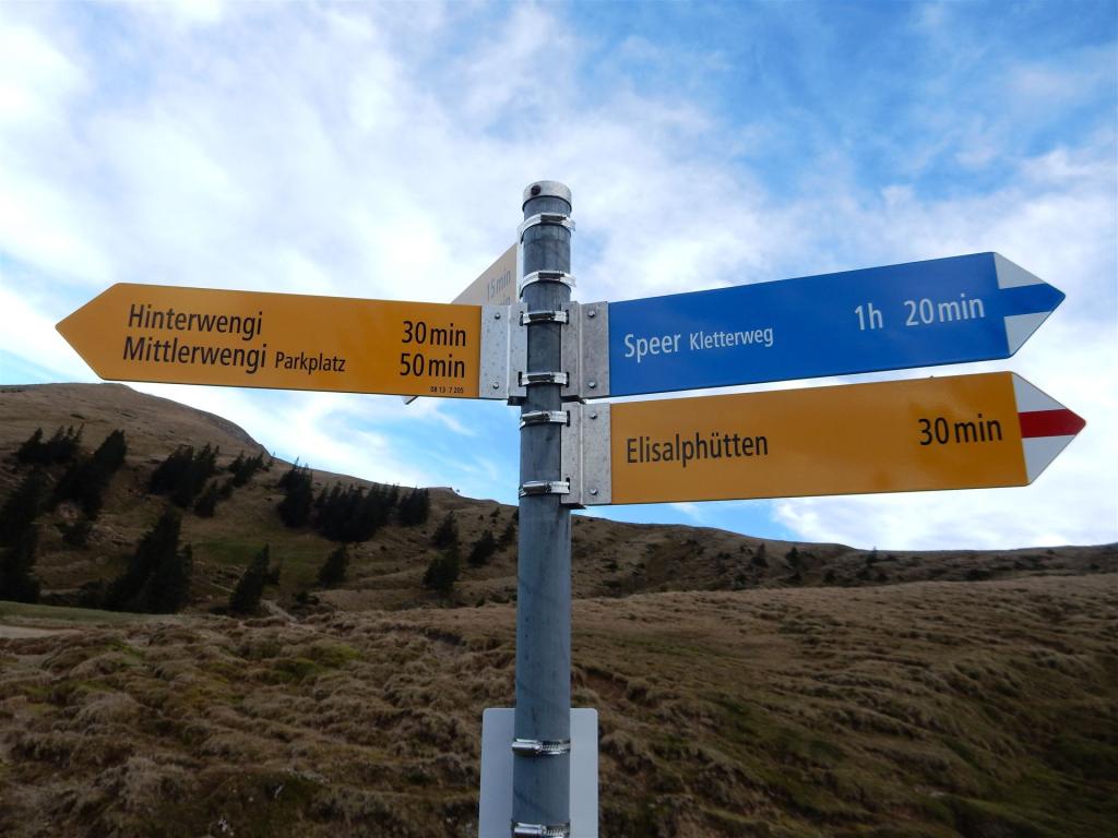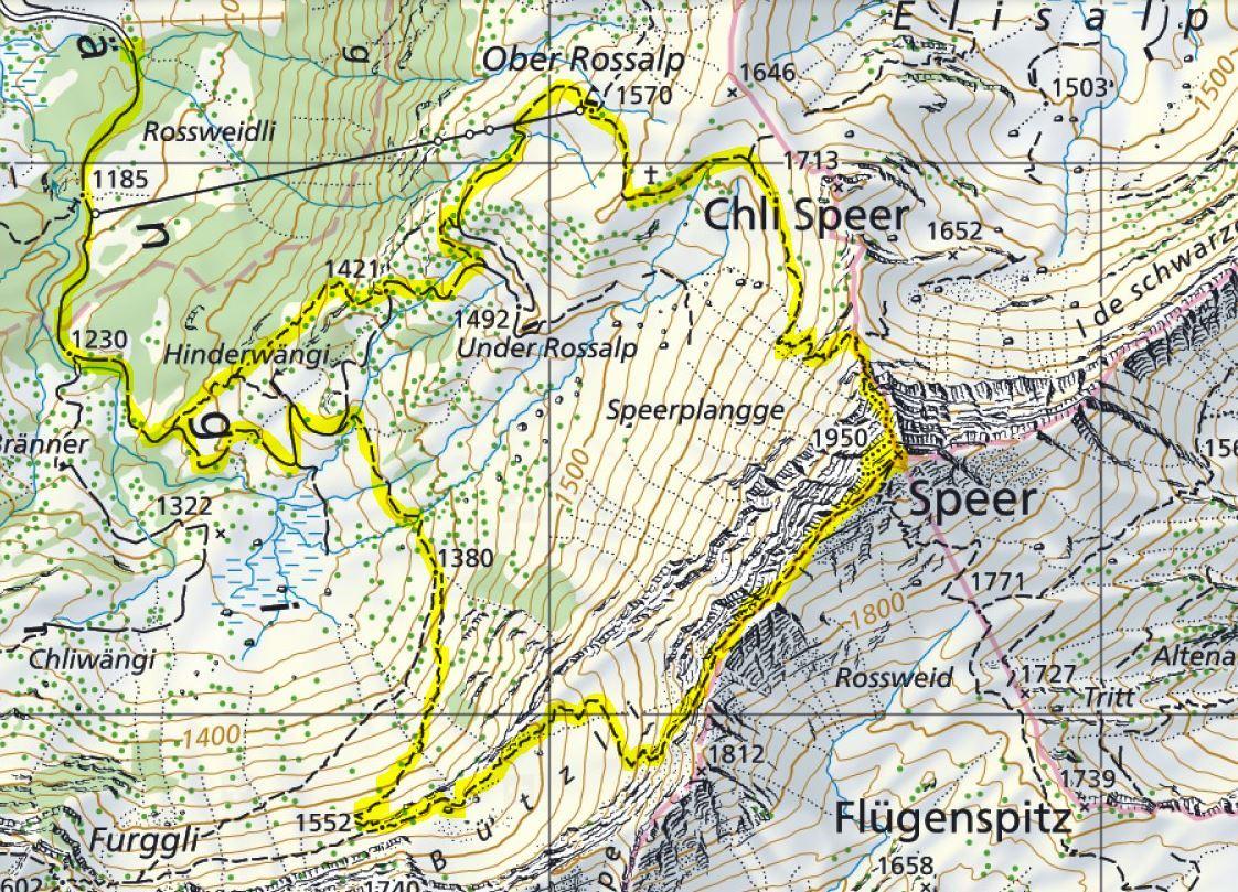 Mittlerwängi (1150m) - Hinterwängi (1341m) - Under Rossalp (1498m) - Ober Rossalp (1570m) - Speer (1951m) - Hinterwängi (1341m) - Mittlerwängi (1150m)