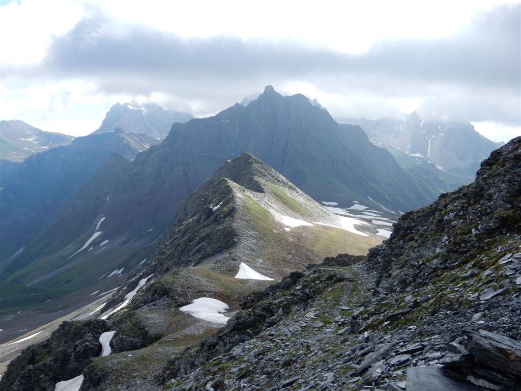 Im Abstieg bei Safierberg, Blick auf Bärenhorn (Mitte hinten), 2. Vorgipfel (links), 1. Vorgipfel (rechts)