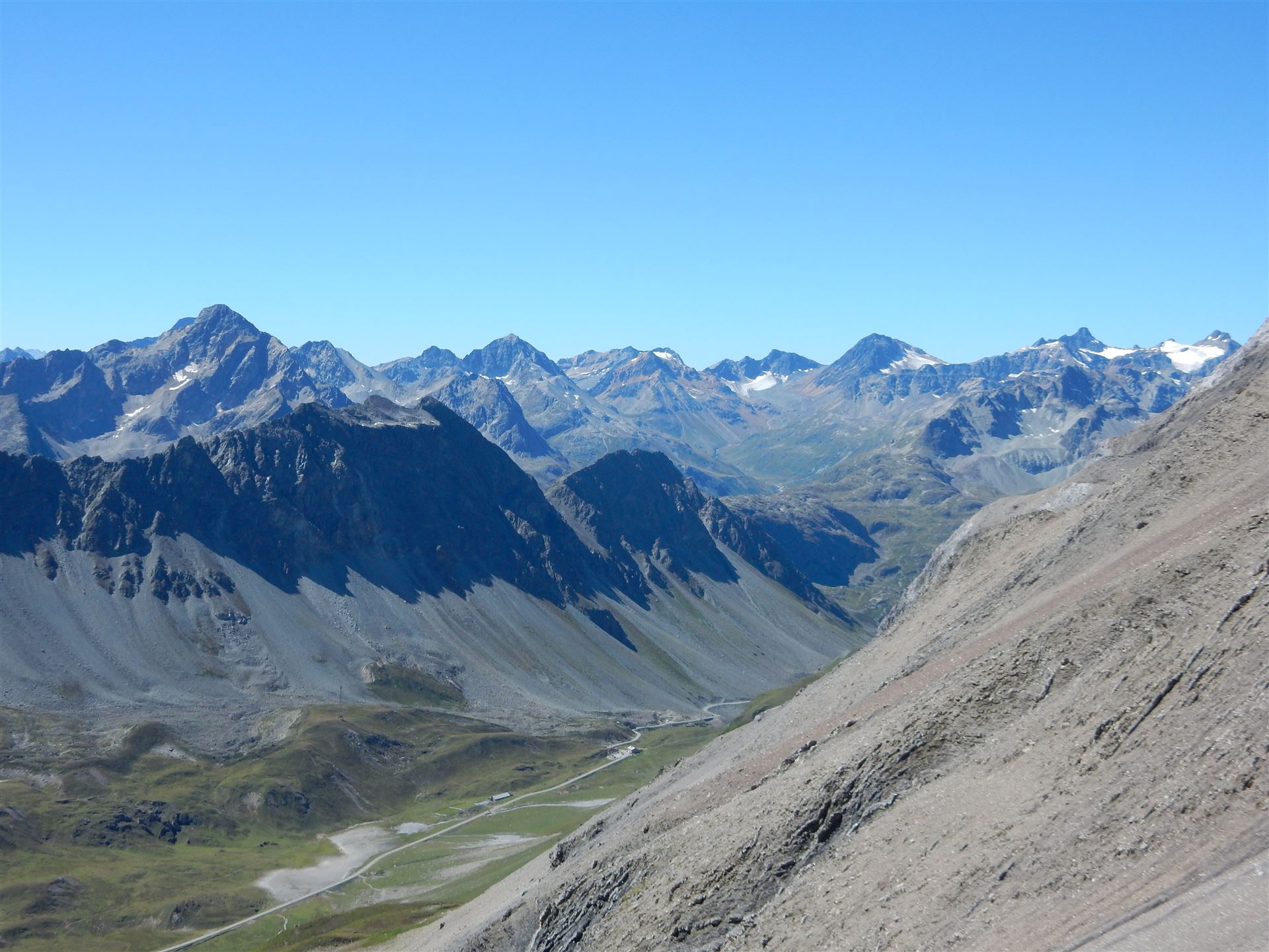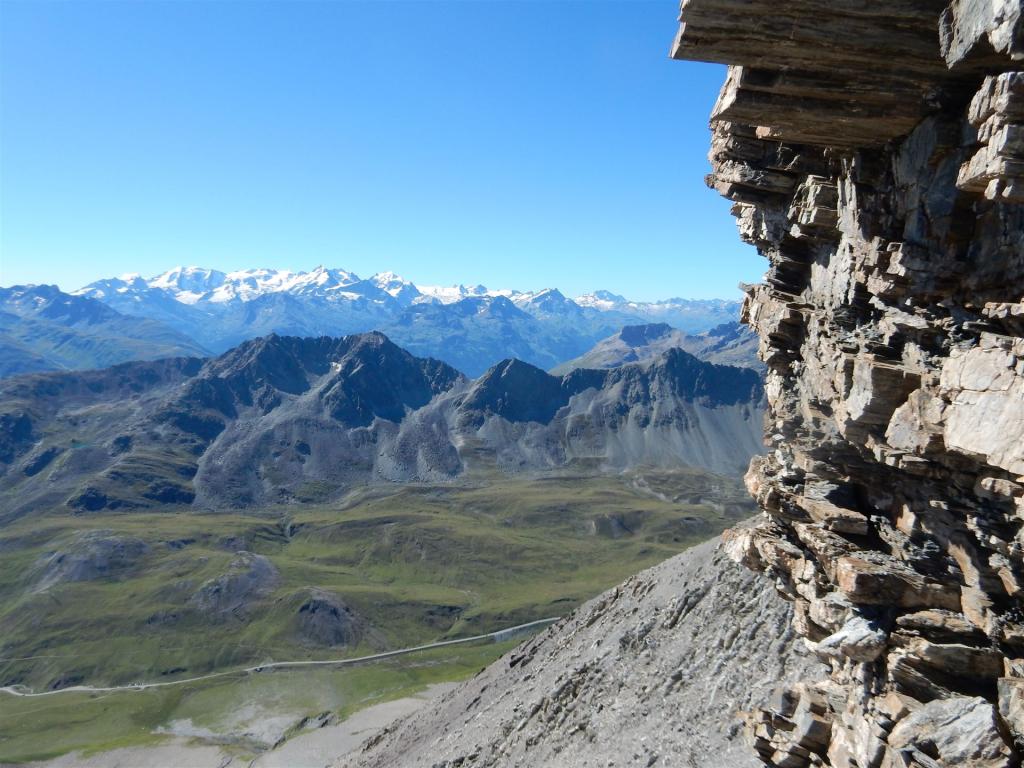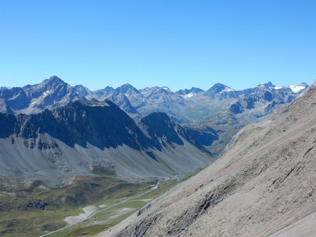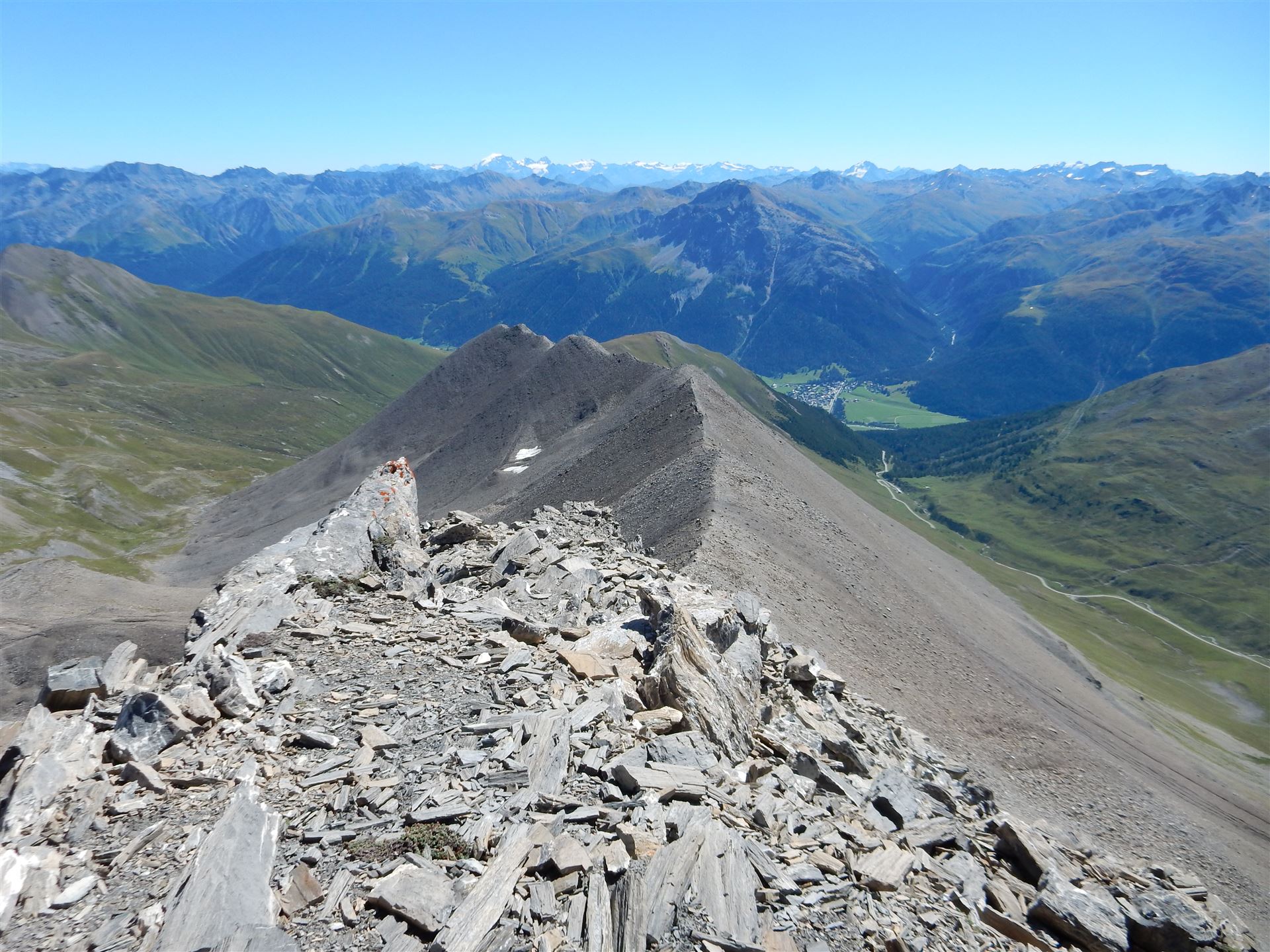 Auf dem Ostgrat, Blick auf Albulapassstrasse und Bernina-Berge