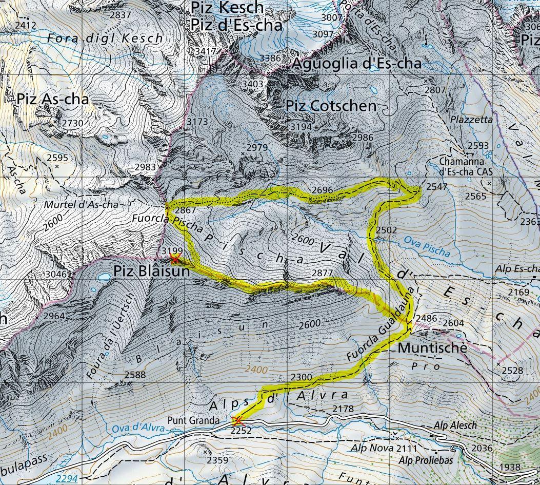 Albulapass (2252m) - Fuorcla Gualdauna (2486m) - Piz Blaisun-Ostgrat - Piz Blaisun unterhalb Gipfel (3100m) - Fuorcla Pischa (2867m) - Fuorcla Gualdauna (2486m) - Albulapass (2252m)