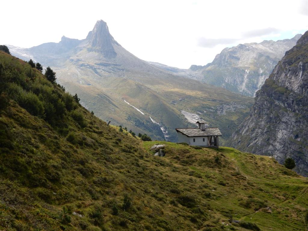 Nach Abstieg kurz vor Ende der Tour, Blick auf Kapelle, Zervreilahorn