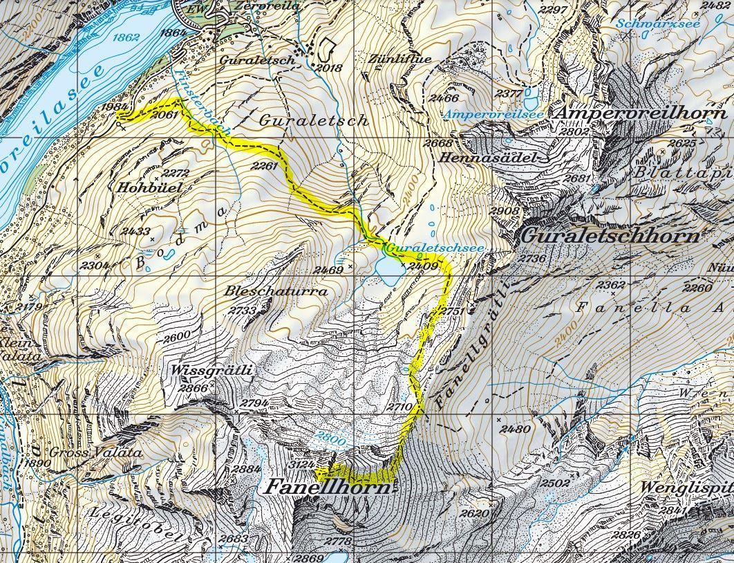 Vals-Zervreila (1984m) - Guraletschsee (2409m) - Fanellgrätli (2710m) - Fanellhorn (3124m) - Fanellgrätli (2710m) - Guraltetschsee (2409m) - Vals-Zervreila (1984m)
