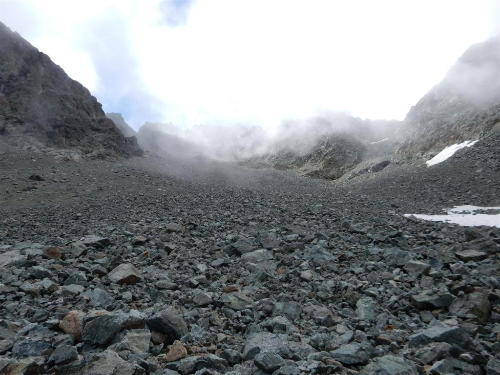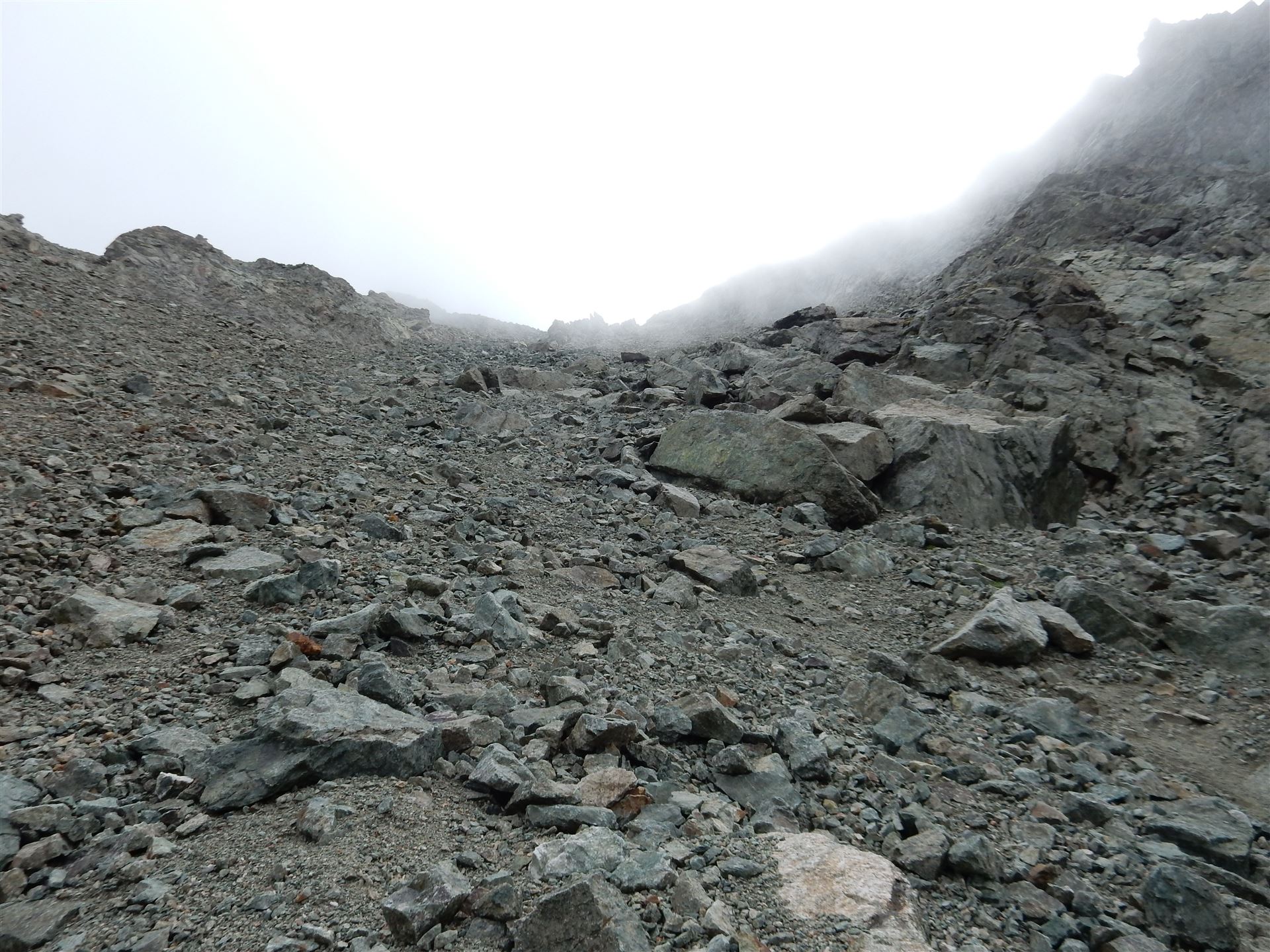 Das Problem war neben der Steilheit das Geröll. Jeder Stein, klein oder gross, war lose und locker, und gab nach. Bei jedem Schritt rutschte alles weg.