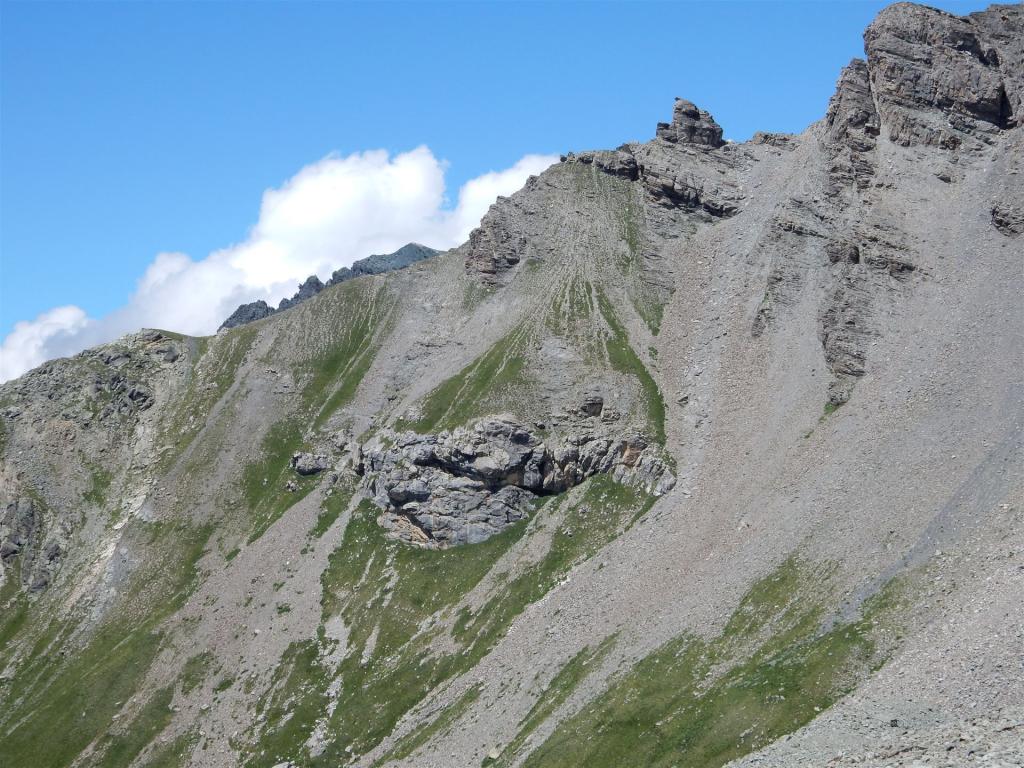 Das Geröllband zieht sich ca. 500hm von Tellers Davains bis zum Westgrat des Piz Calderas hoch. Zuerst nach Süden, dann ein Knie und nach Osten.