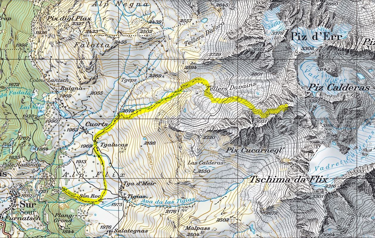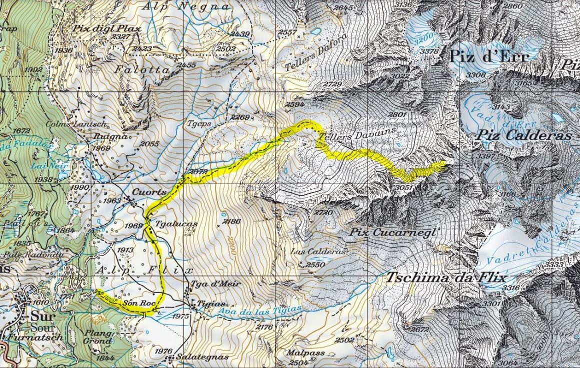 Sur-Vanastg (1900m) - Tgalucas (1969m) - Tellers Davains - Piz Calderas unterhalb Gipfel (3150m) - Tellers Davains - Tgalucas (1969m) - Sur-Vanastg (1900m)