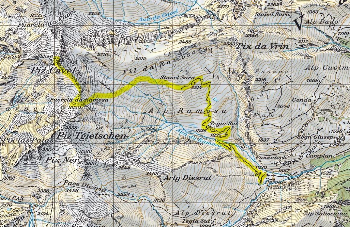 Puzzatsch (Val Lumnezia) (1630m) - Tegia Sut (1926m) - Fuorcla da Ramosa (2650m) - Piz Cavel (2946m) - Fuorcla da Ramosa (2650m) - Tegia Sut (1926m) - Puzzatsch (Val Lumnezia) (1630m)