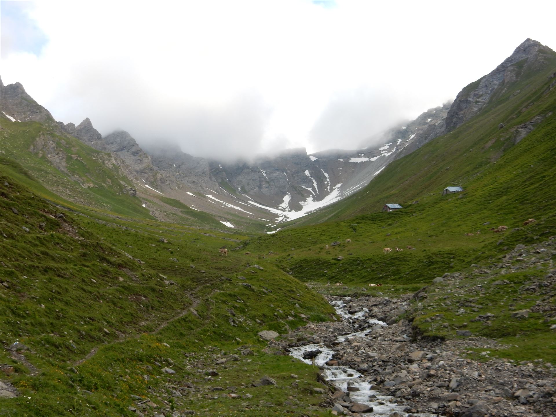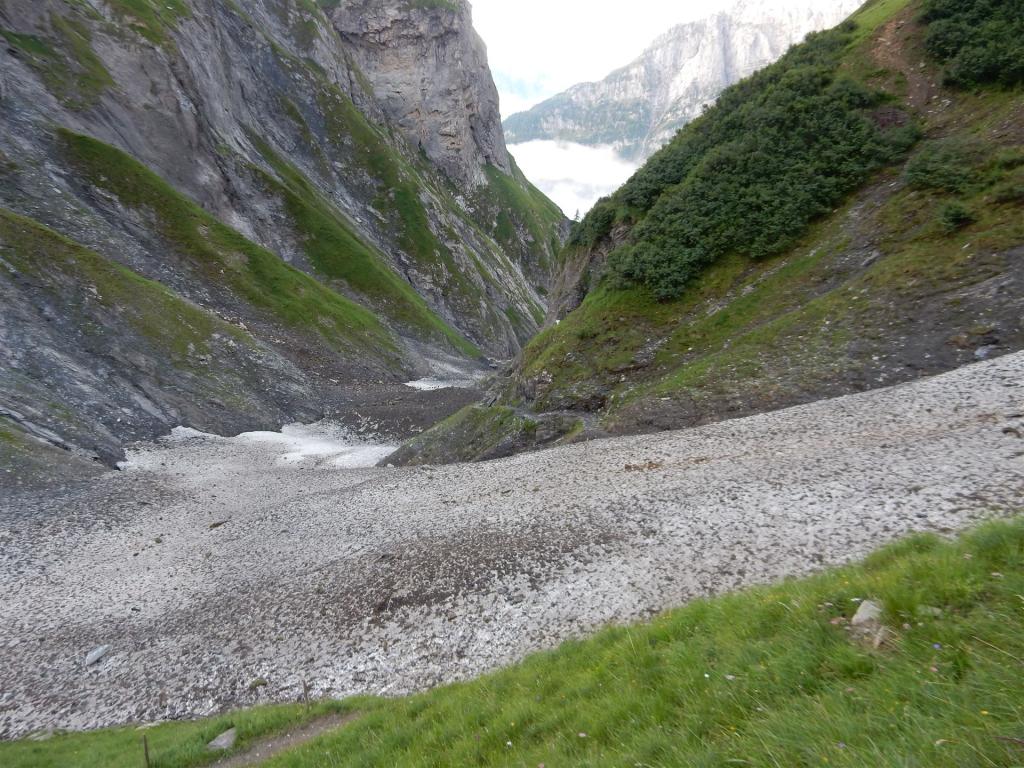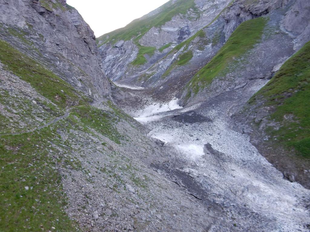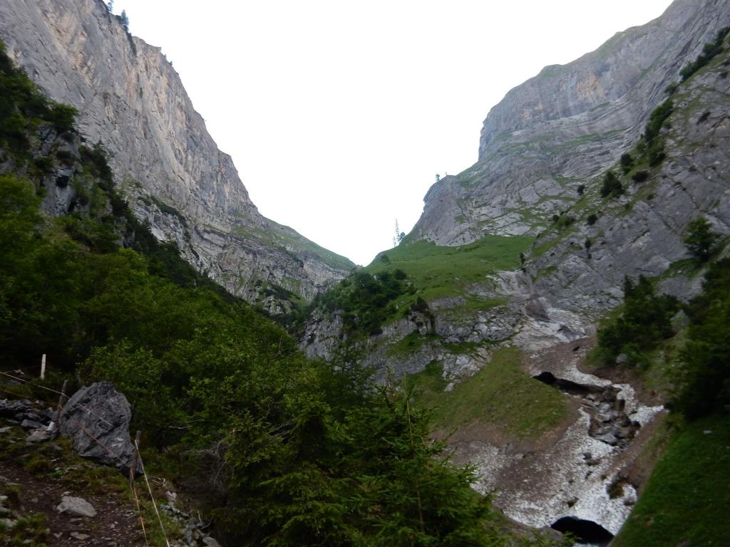 Vom Start geht es über sehr steile ca. 700m durch die Schlucht bergauf zur Alp (Tersol). Dann geht es bis zum Talkessel moderat und die Schneefelder erleichtern sogar das Gehen.