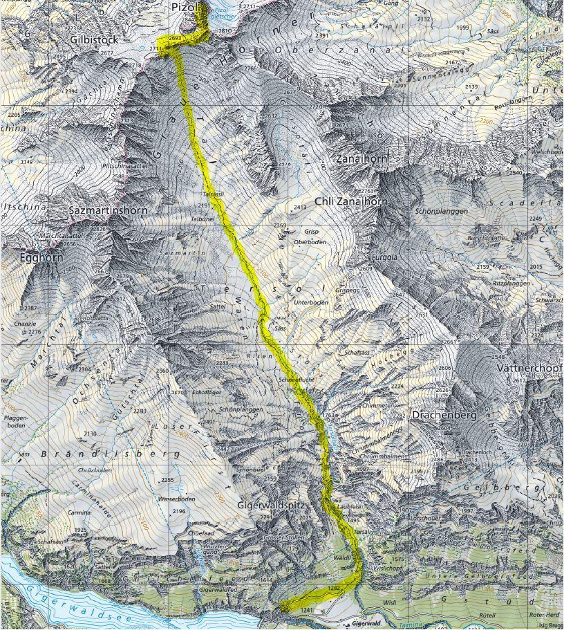 Vättis-Gigerwald (1320m) - Tal Tersol-Säss (2002m) - Pizolsattel (2693m) - Pizol (2844m) - Pizolsattel (2693m) - Tal Tersol-Säss (2002m) - Vättis-Gigerwald (1320m)