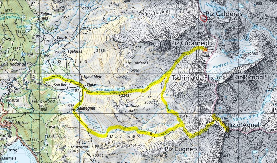 Sur-Vanastg (1900m) - Tigias (1975m) - unterhalb Westcouloir zum Vadret Calderas (2900m) - Lai Blo (2541m) - Fuorcla da Flix (3065m) - Piz d'Agnel (3204m) - Fuorcla da Flix (3065m) - Salategnas (1976m) - Tigias (1975m) - Sur-Vanastg (1900m)