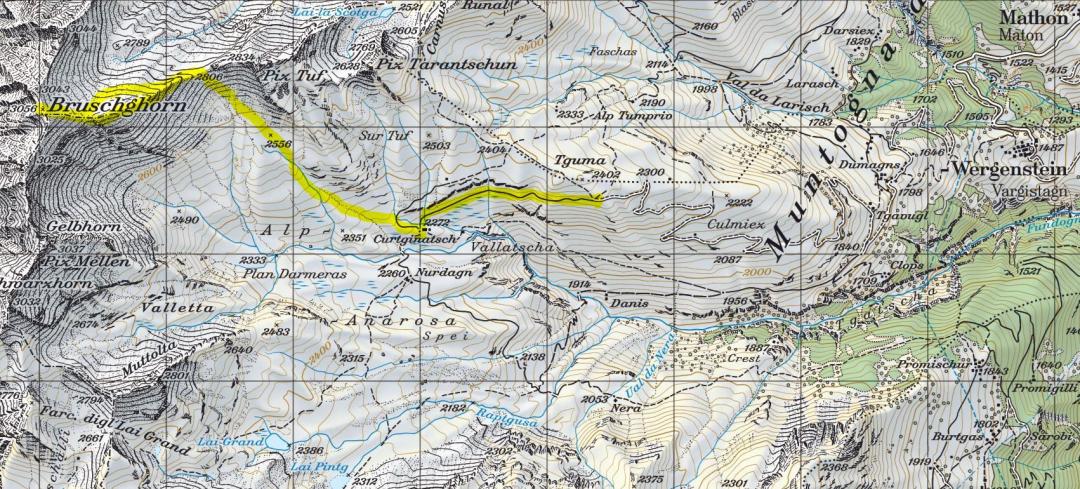 Wergenstein-Tguma (2340m) - Curtginatsch (2272m) - Pt. 2806 Ostgrat von Bruschghorn (2806m) - Bruschghorn (3056m) - Pt. 2962 auf Ostgrat von Bruschghorn (2962m) - Pt. 2806 Ostgrat von Bruschghorn (2806m) - Curtginatsch (2272m) - Wergenstein-Tguma (2340m)
