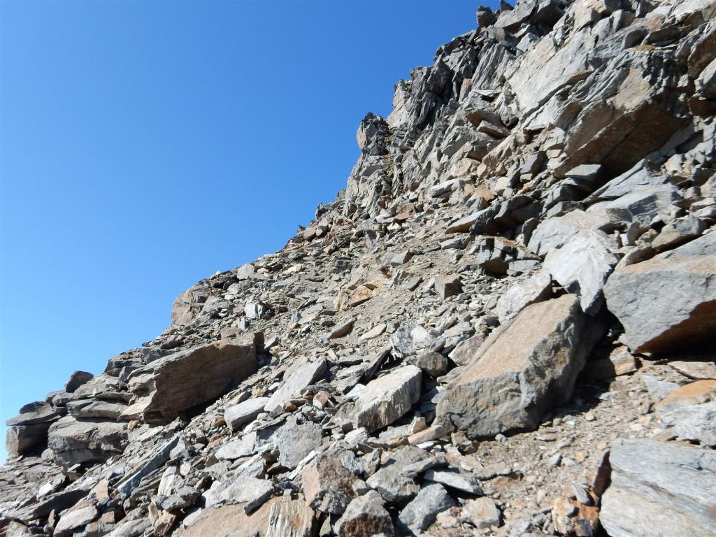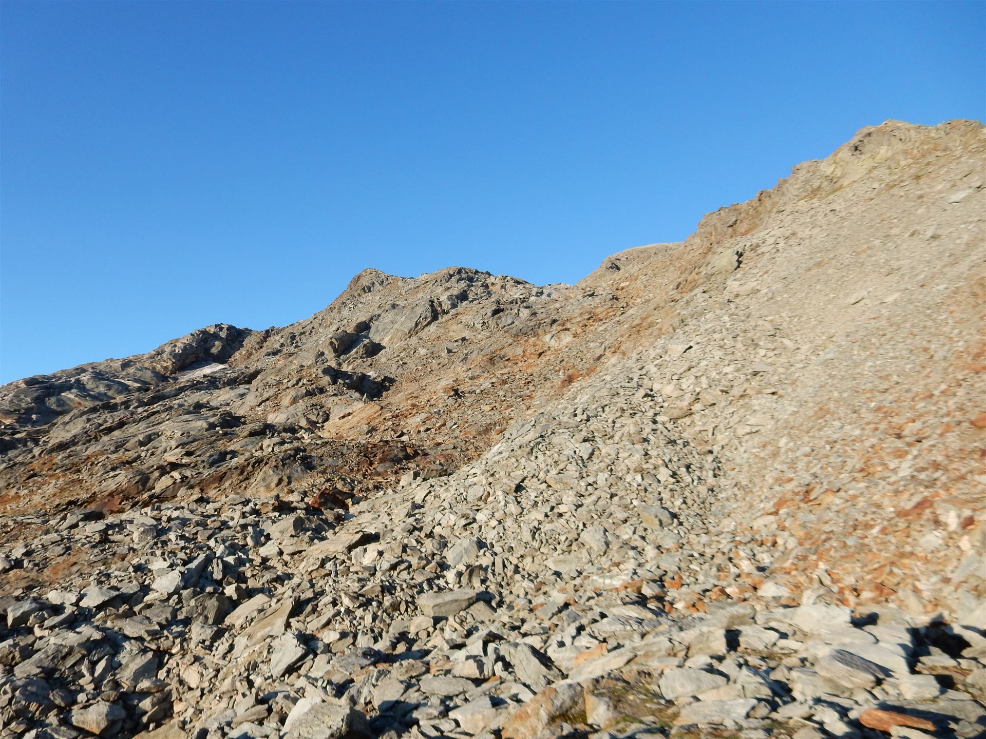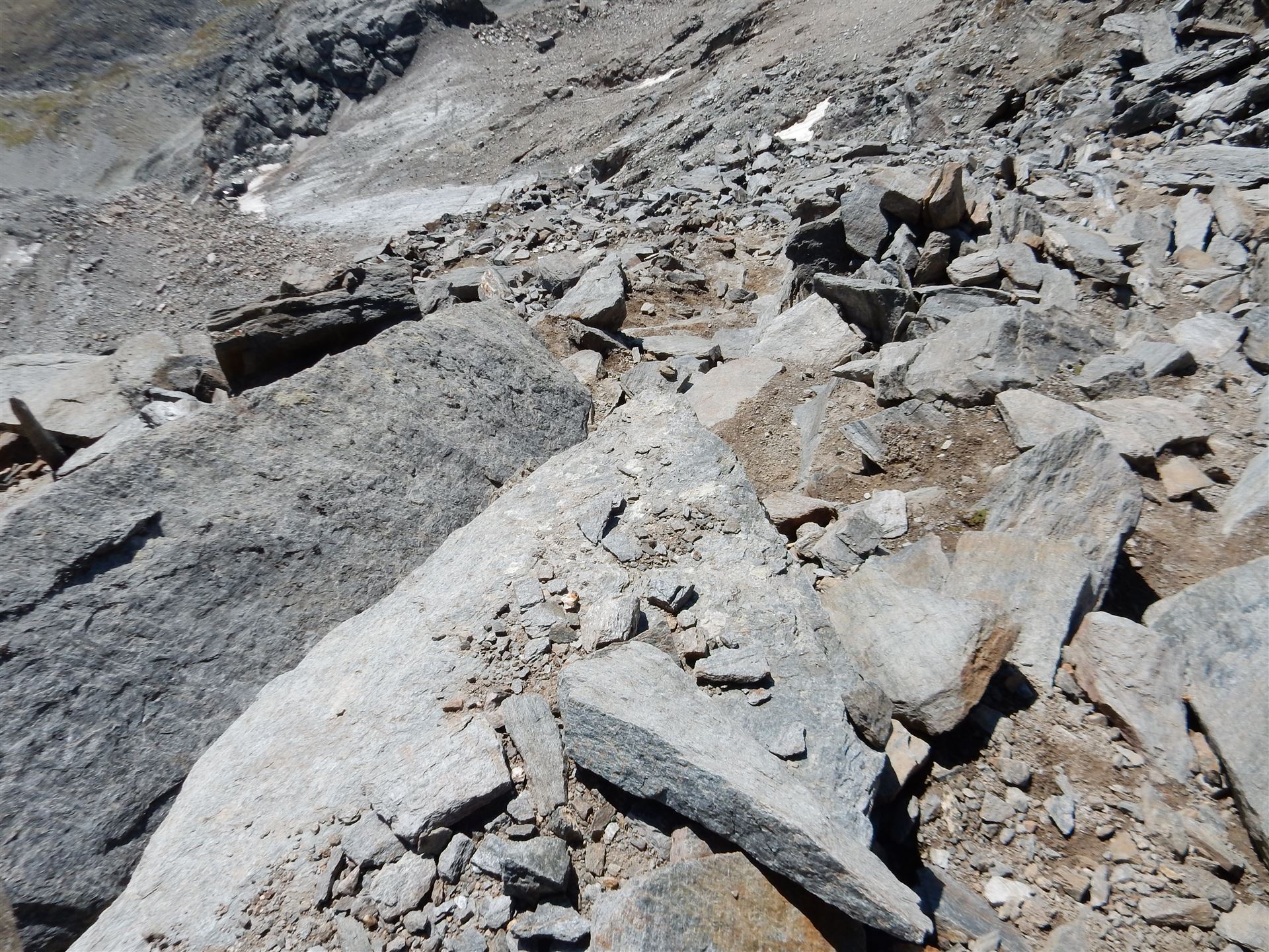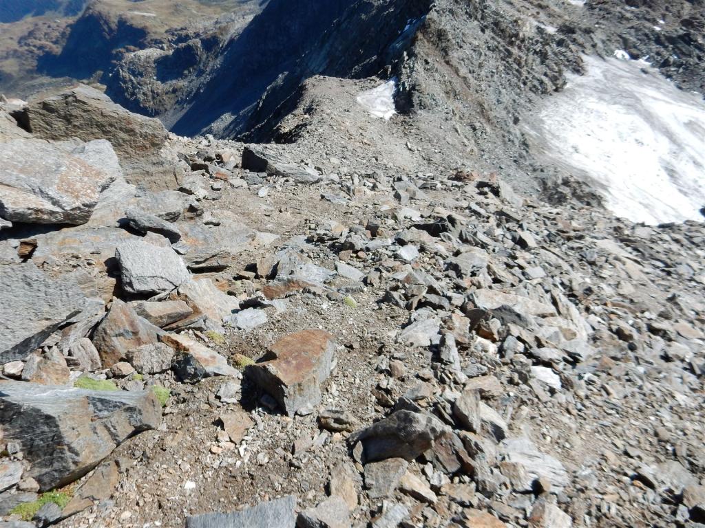 Der Weg ist nicht markiert, z.B. weiss-rot-weiss, sondern mit Steinmännchen. Manchmal fehlt dann die Sicht auf das nächste Steinmännchen. Manchmal sind zu viele Steinmännchen an verschiedenen Orten vorhanden. Dadurch hat das Finden des besten Weges bei mir nicht immer geklappt.