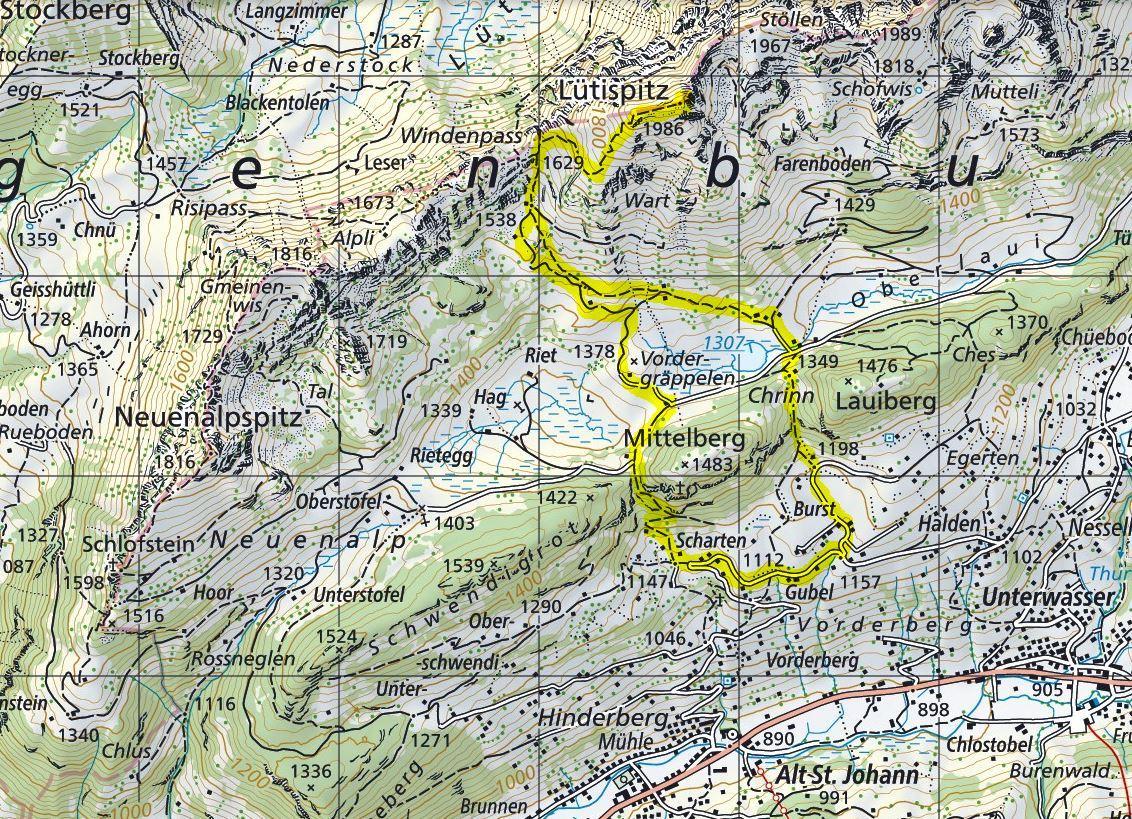 Alt St. Johann-Burst (1157m) - Chrinn (1349m) - Windenpass (1629m) - Lütispitz (1986m) - Windenpass (1629m) - Risi (1344m) - Alt St. Johann-Burst (1157m)