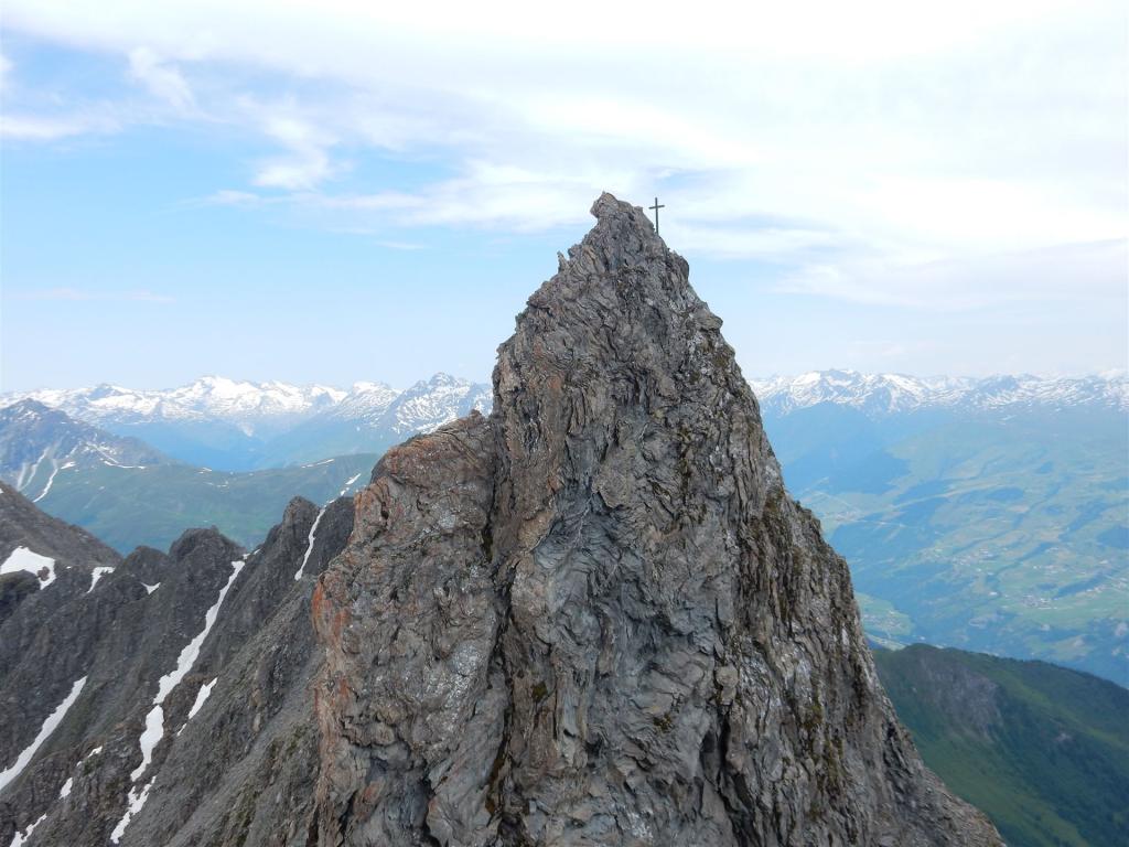 Der Piz Fess besteht aus 2 Gipfeln. Der "Chli Fess" mit 2876m (begehbar) mit Steinmännchen und der "Bös Fess" mit 2881m als spitziger Berg mit Kreuz (aus meiner Sicht nicht begehbar).
