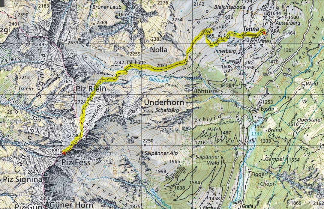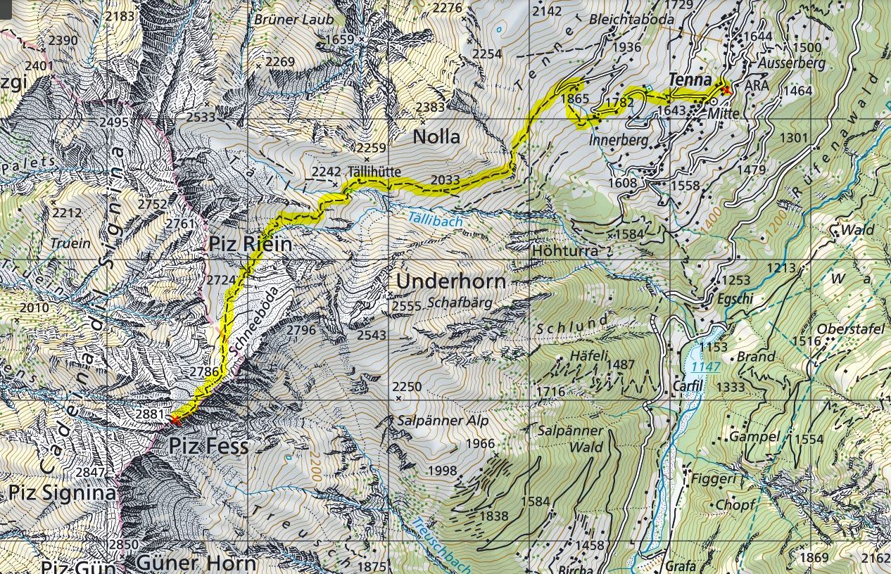 Safiental-Tenna (1645m) - Tällihütte (2242m) - Piz Fess (2876m) -Tällihütte (2242m) - Safiental-Tenna (1645m)