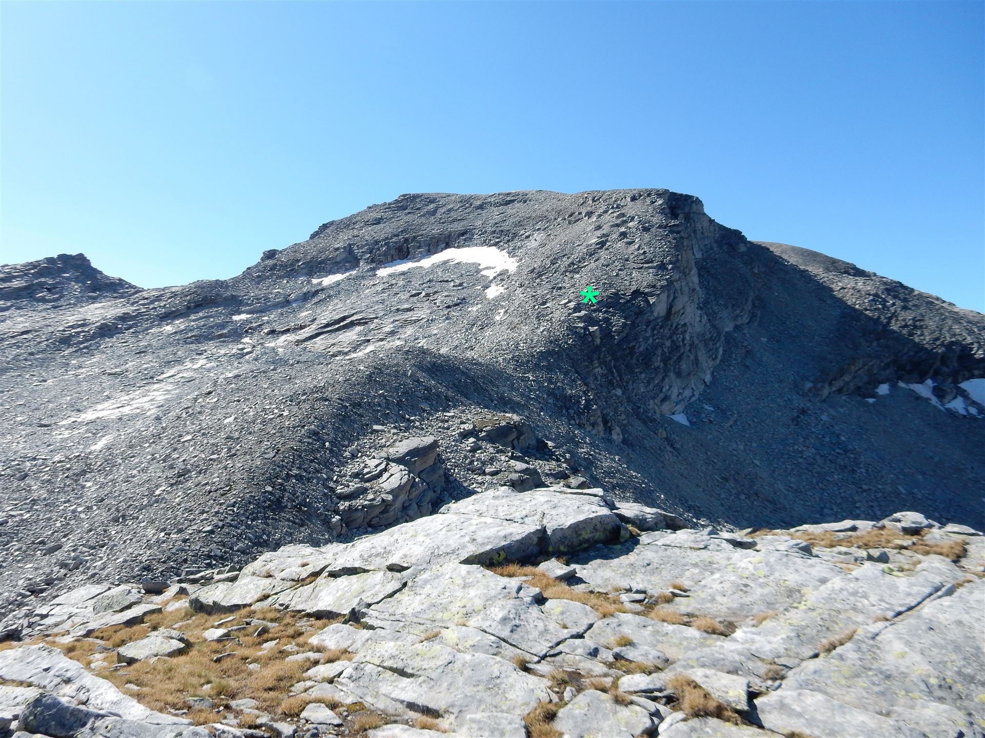 Nach Abstieg auf dem Furggelti, Blick auf Furggeltihorn mit Wendepunkt (grüner Stern)