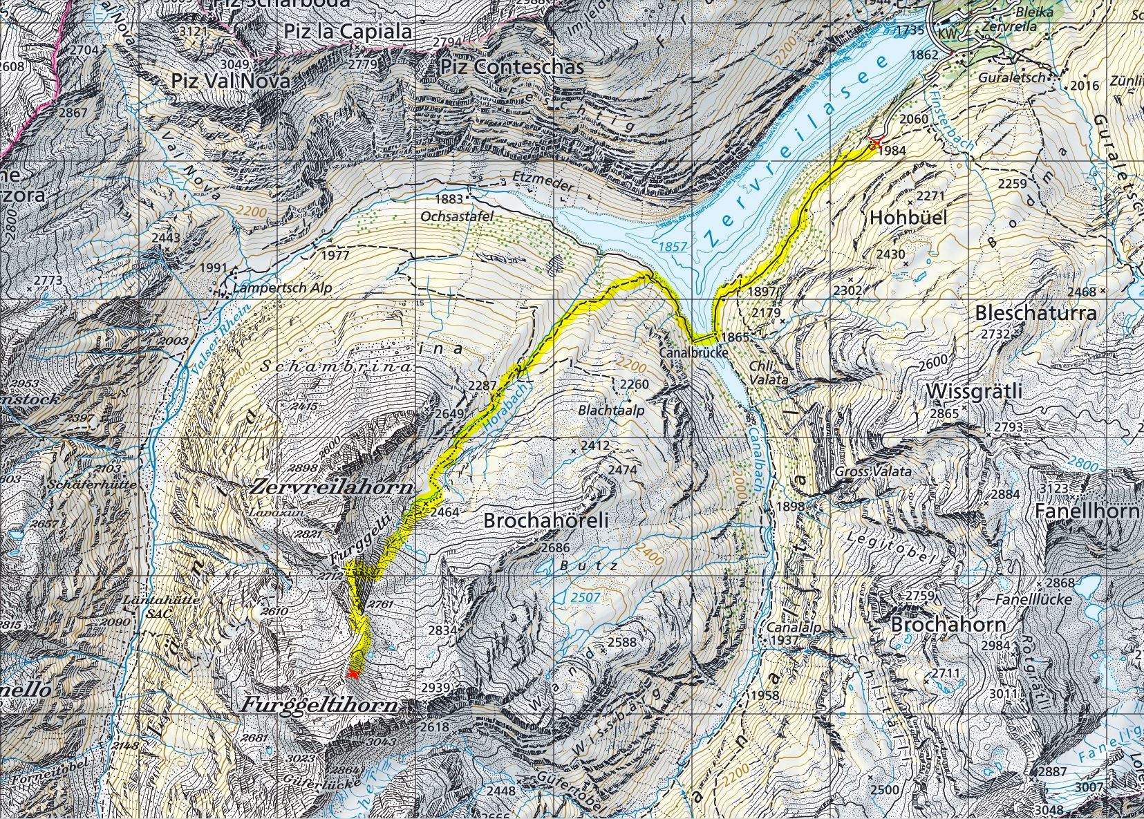 Zervreilasee Parkplatz bei der Kapelle (1984m) - Canalbrücke (1865m) - Furggelti (2712m+2761m) - Furggeltihorn unterhalb Gipfel (2870m) - Furggelti (2712m+2761m) - Canalbrücke (1865m) - Zervreilasee Parkplatz bei der Kapelle (1984m)