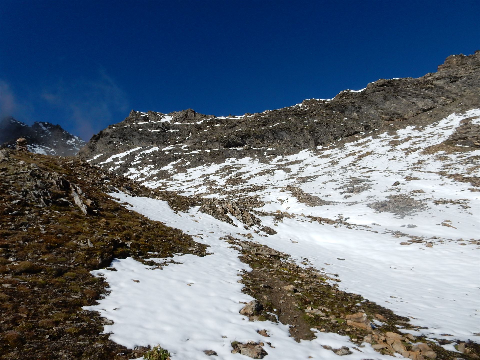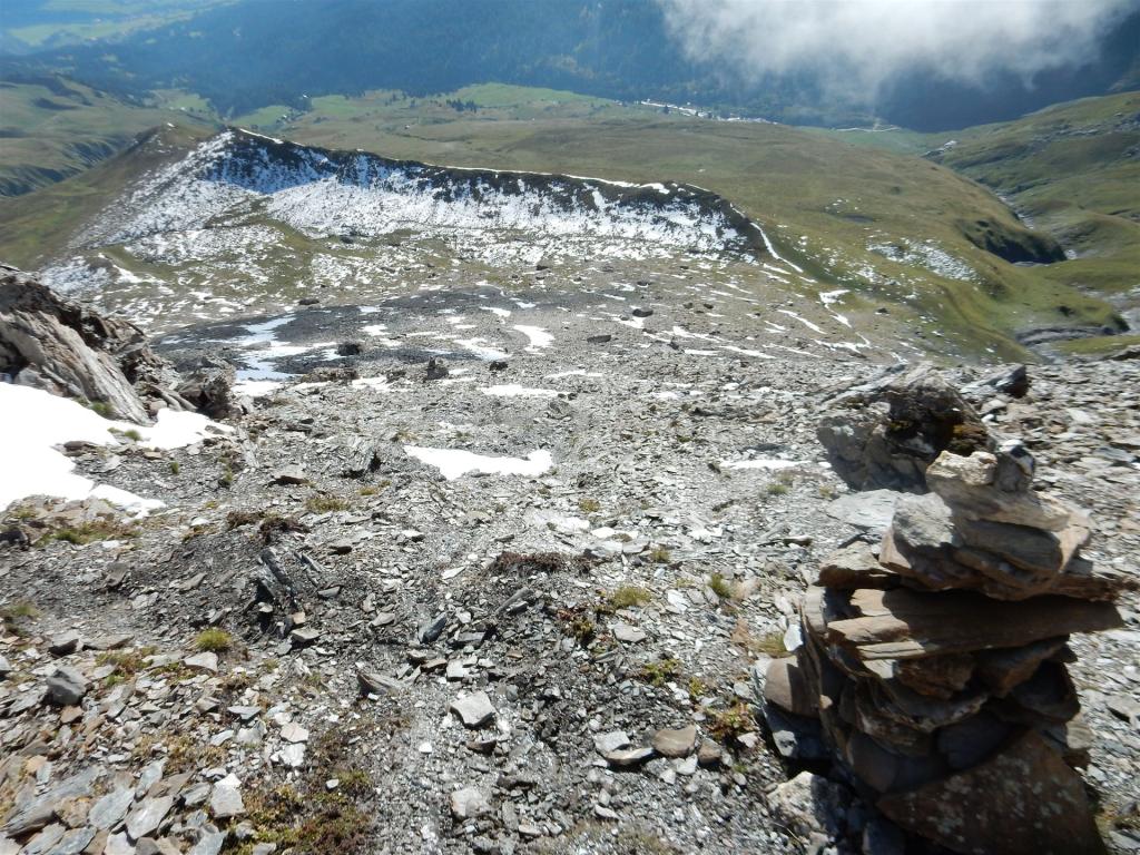 Auf dem Nordgratsattel hat mich dann die Schneemenge der Nordseite des Piz Curver ziemlich überrascht. Das ergab das Problem, dass der Weg nicht ersichtlich war. Allerdings war der Schnee gut zum gehen und ich hätte meinen eigenen Weg gehen können.