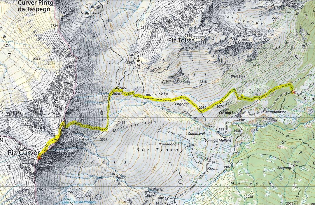 Cunter-Salouf-Sars (1800m) - Ziteil (2427m) - Nordgratsattel (2820m) - Piz Curver (2972m) - Nordgratsattel (2820m) - Ziteil (2427m) - Cunter-Salouf-Sars (1800m)