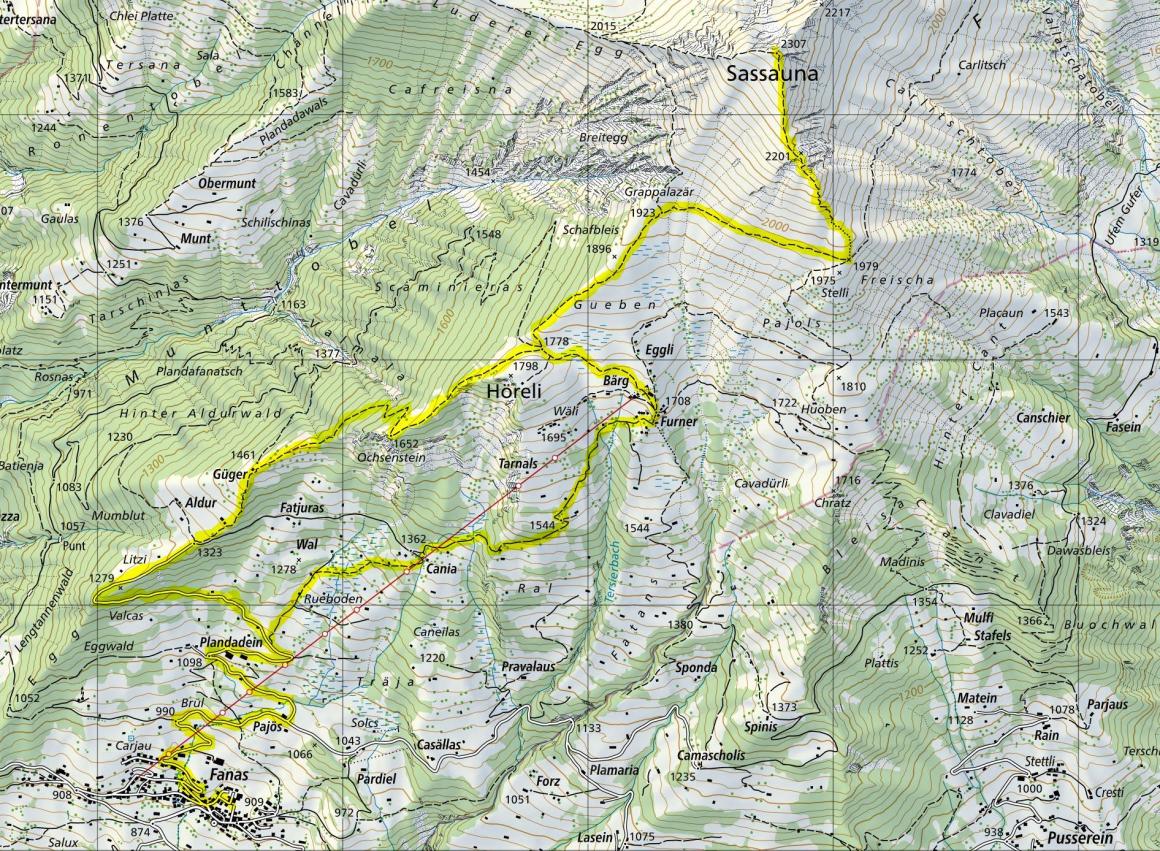 Grüsch-Fanas (909m) - Ochsenstein (1652m) - Pt. 1979 (1979m) - Sassauna (2307m) - Pt. 1979 (1979m) - Cania (1368m) - Grüsch-Fanas (909m)