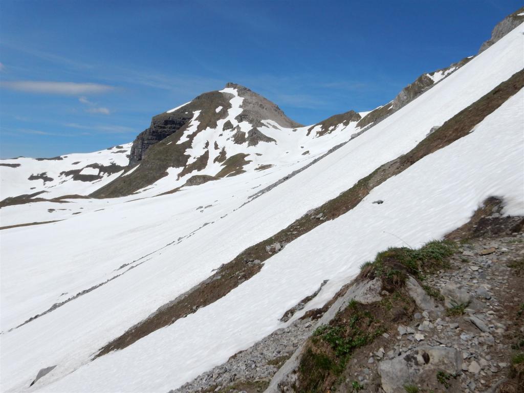 Bei 1900m, Überquerung des 1. Schneefeldes, Blick auf Tschingel (ganz links)