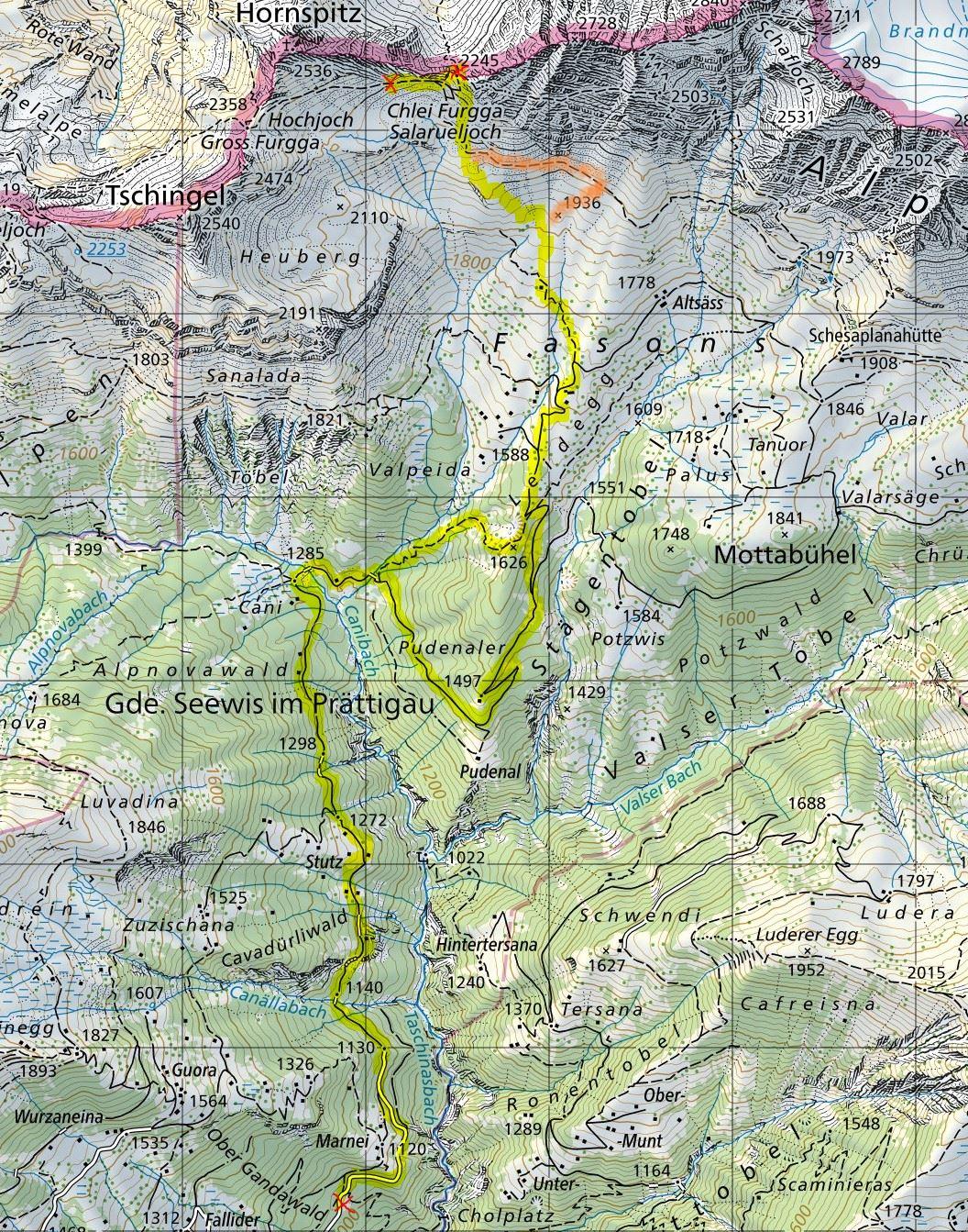 Seewis-Dorf, Parkplatz Gandawald (1044m) - Cani (1285m) - Stopp-Punkt Rastplatz (2222m) - Chlei Furgga / Salarueljoch (2245m) - Cani (1285m) - Seewis-Dorf, Parkplatz Gandawald (1044m)