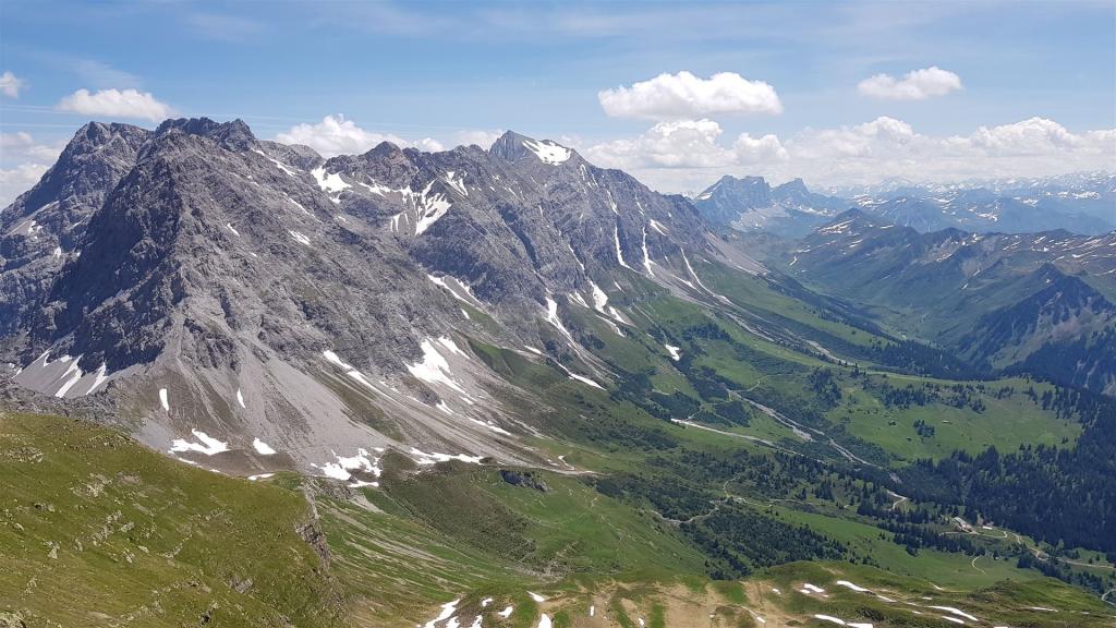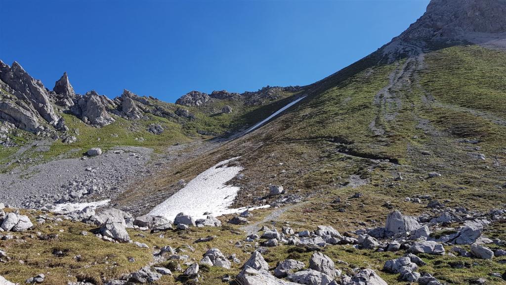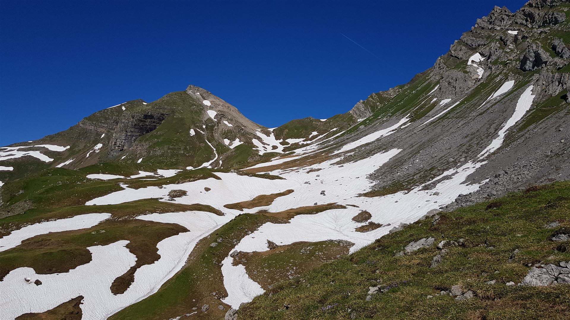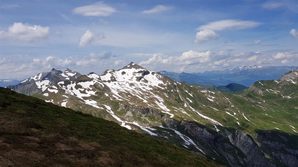 Auf dem Tschingel, Blick auf Aufstiegsroute von Gross Furgga, Fundelkopf, Hornspitz, Schafberg, Panüeler Kopf, Salaruelkopf