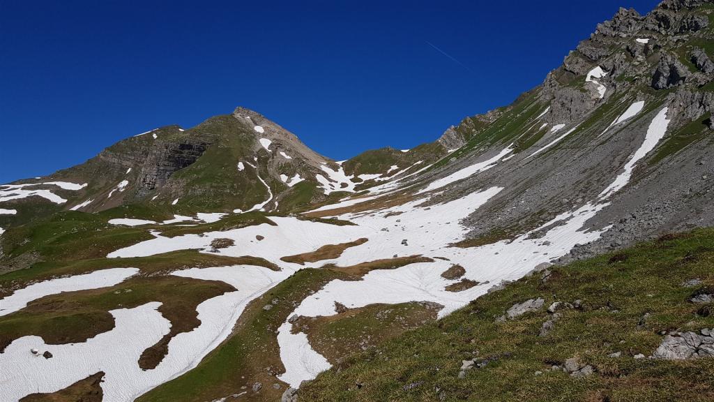 Bei ca. 2050m, Blick auf Tschingel (links), Hornspitz (rechts), Gross Furgga (dazwischen)