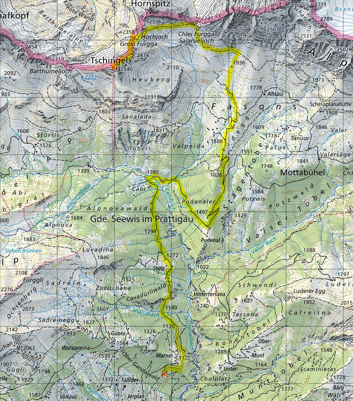 Seewis-Dorf, Parkplatz Gandawald (1044m) - Cani (1285m) - Gross Furgga / Hochjoch (2358m) - Tschingel (2541m) - Gross Furgga / Hochjoch (2358m) - Cani (1285m) - Seewis-Dorf, Parkplatz Gandawald (1044m)