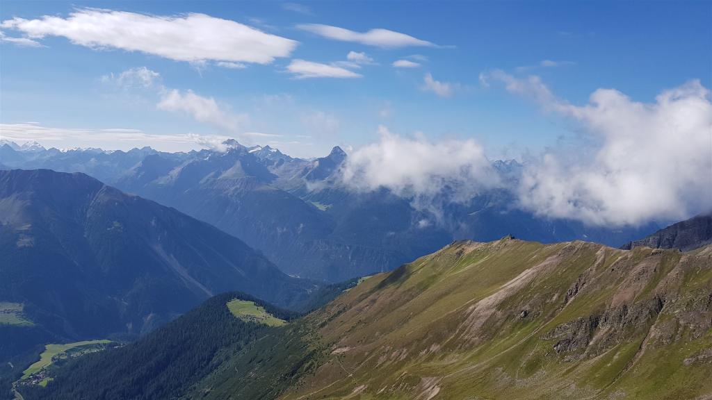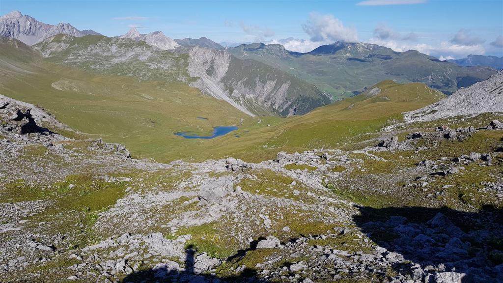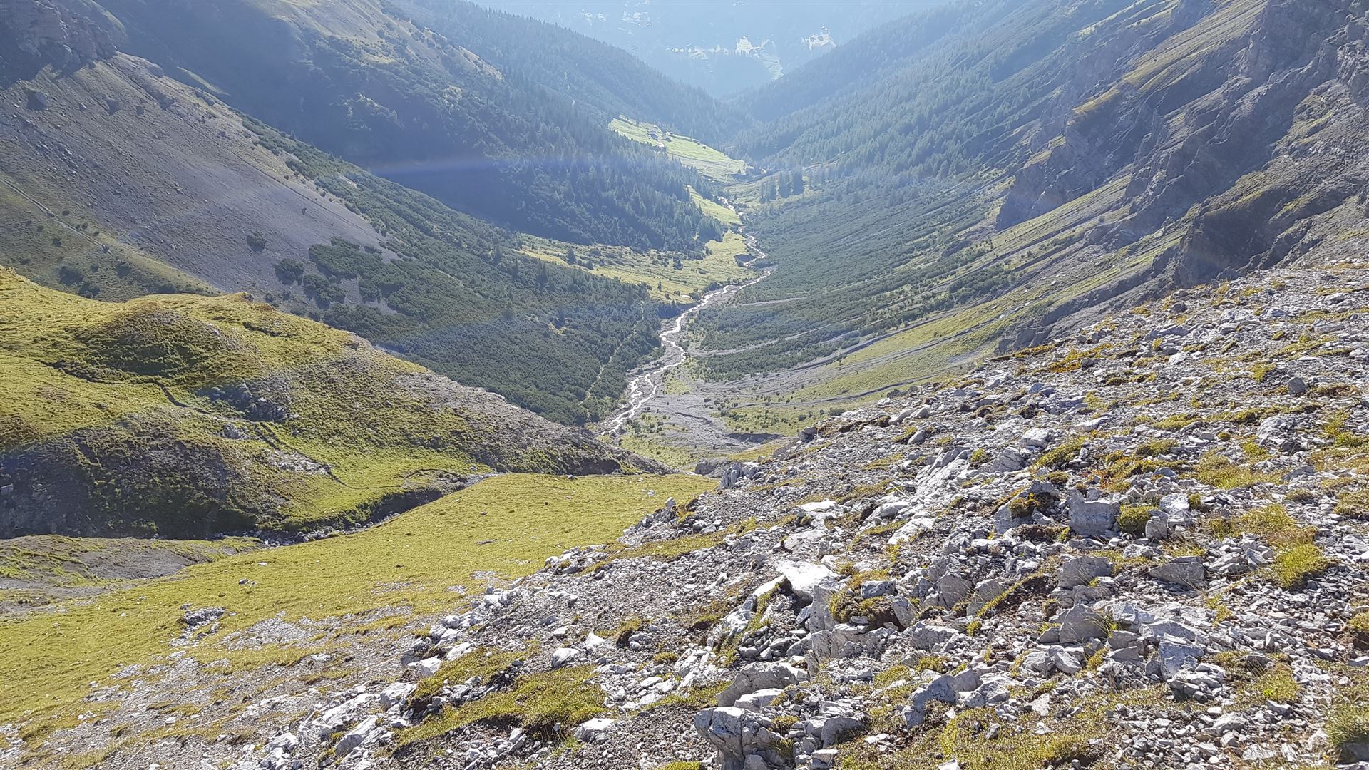 Auf dem Valbellahorn, Blick zum Alteiner Fürggli und das Bärental hinten nach rechts