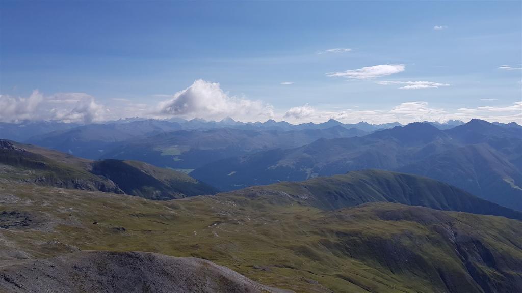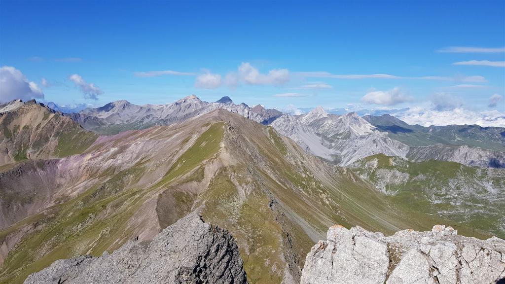 Auf dem Valbellahorn, Blick auf Sandhubel (vorn) und Aroser Rothorn, Parpaner Rothorn, Parpaner Weisshorn, Erzhorn u.a.
