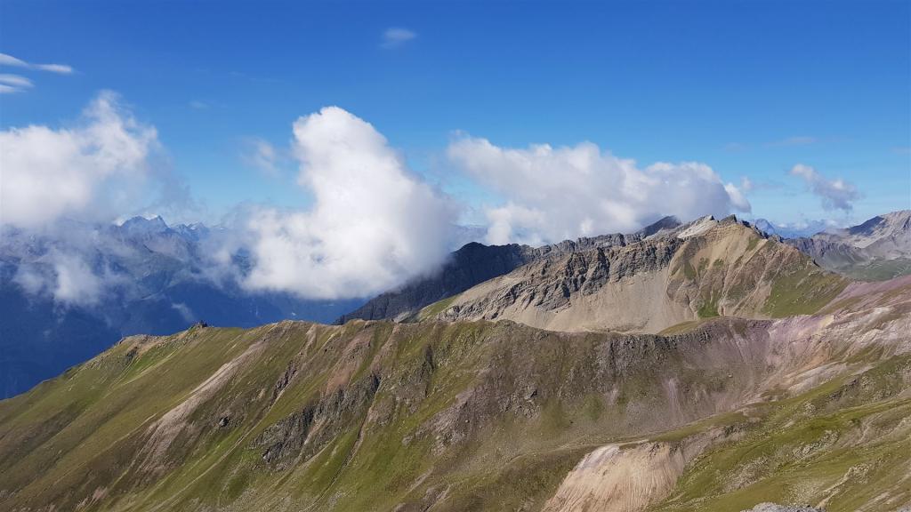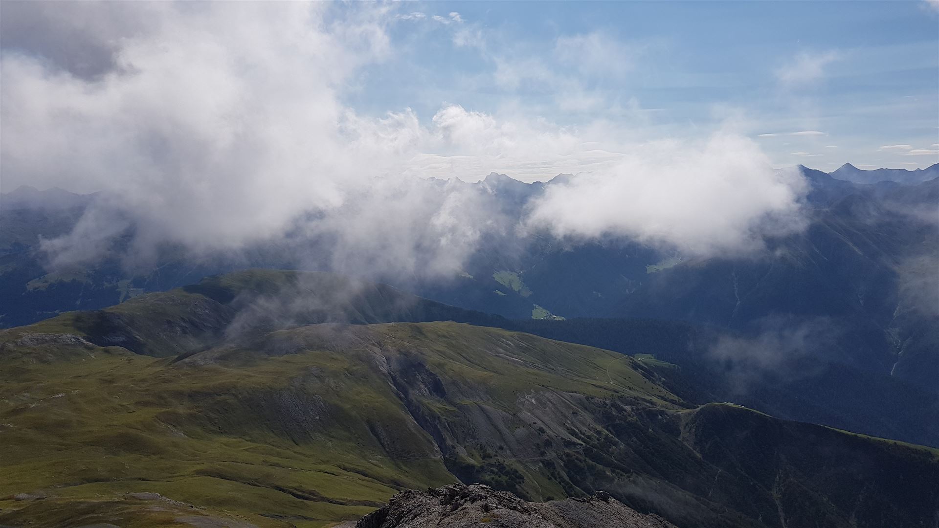 Auf dem Valbellahorn, Blick auf Piz Ela, Tinzenhorn mit Wolken