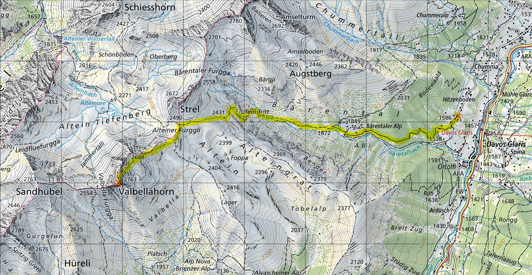 Davos Glaris-Rüti (1586m) - Alteiner Fürggli (2490m) - Valbellahorn (2763m) - Alteiner Fürggli (2490m) - Davos Glaris-Rüti (1586m)