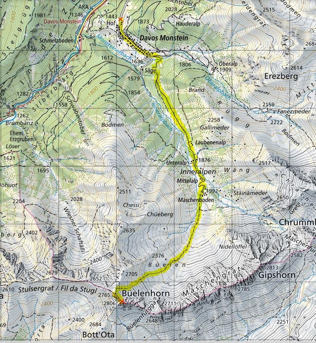 Davos Monstein (1580m) - Mäschenboden (1992m) - Nordgrat Büelenhorn (2765m) - Büelenhorn (2806m) - Nordgrat Büelenhorn (2765m) - Mäschenboden (1992m) - Davos Monstein (1580m)