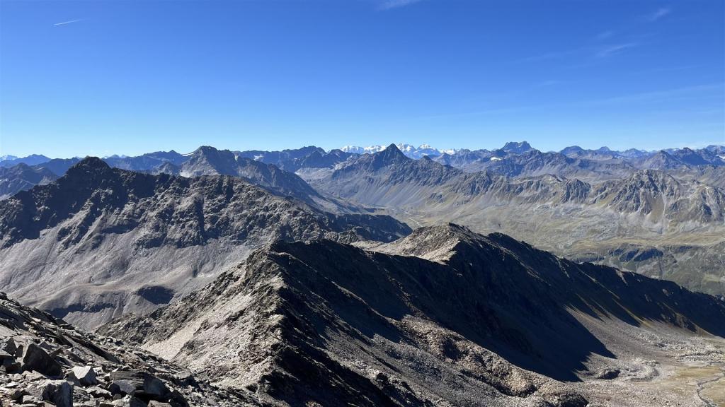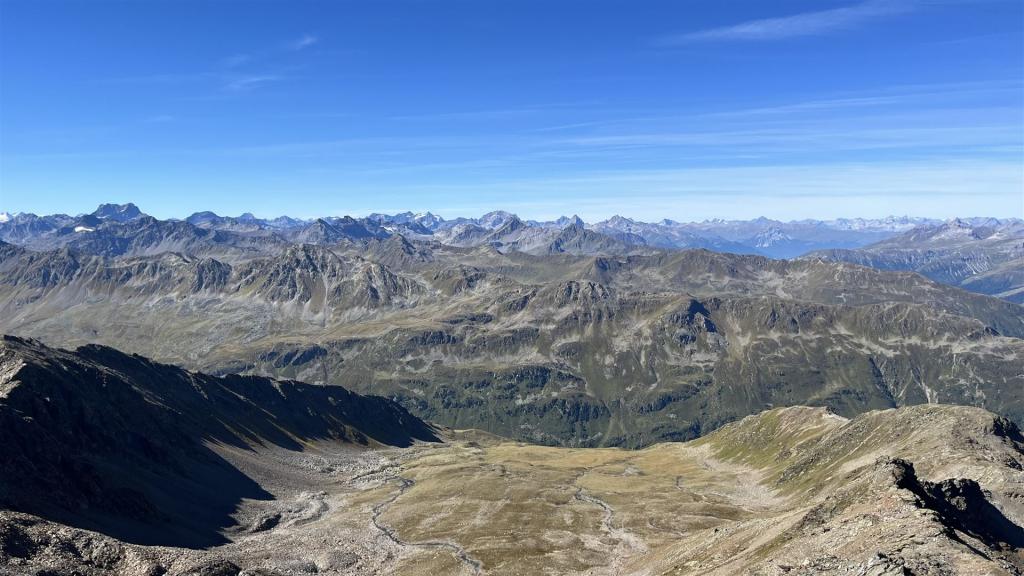 Auf dem Pischahorn, Blick auf Flüela Wisshorn, Schwarzhorn, Piz Kesch, Bernina-Berge