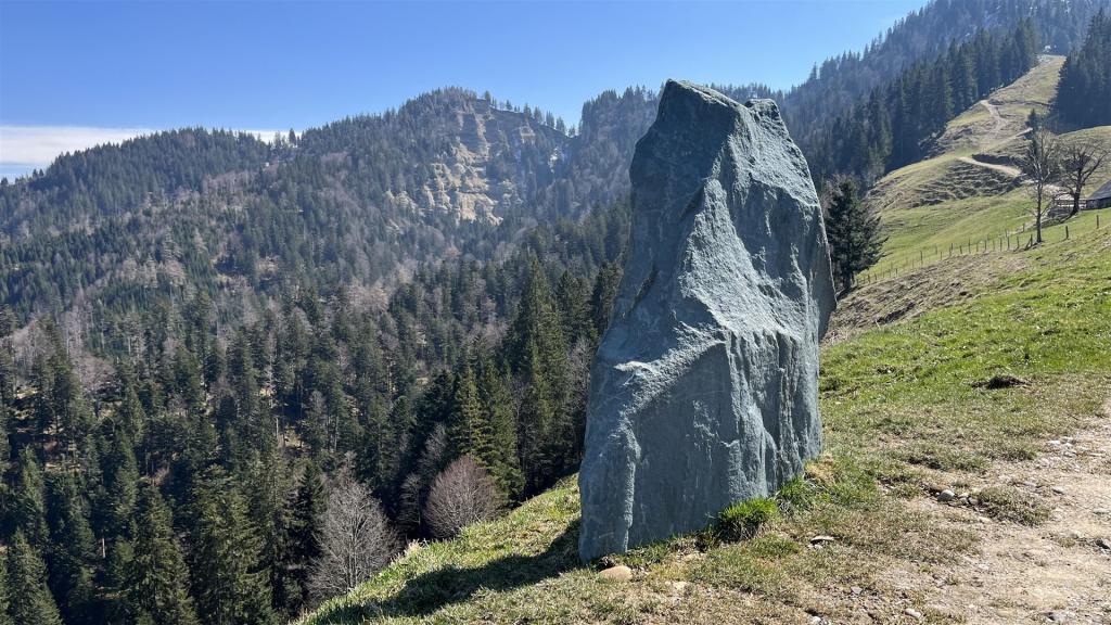 Im Abstieg bei Trachselegg, Stein-Statue mit Hängst im Hintergrund