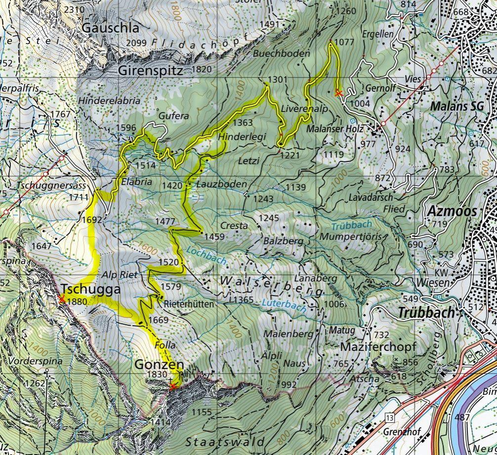 Oberschan-Vermärsch Parkplatz P1 (1020m) - Scheidweg (1363m) - Rieterhütten (1579m) - Pt. 1669 - Gonzen (1830m) - Pt. 1669 - Tschugga (1880m) - Cham Pt. 1711 (1711m) - Scheidweg (1363m) - Oberschan-Vermärsch Parkplatz P1 (1020m)