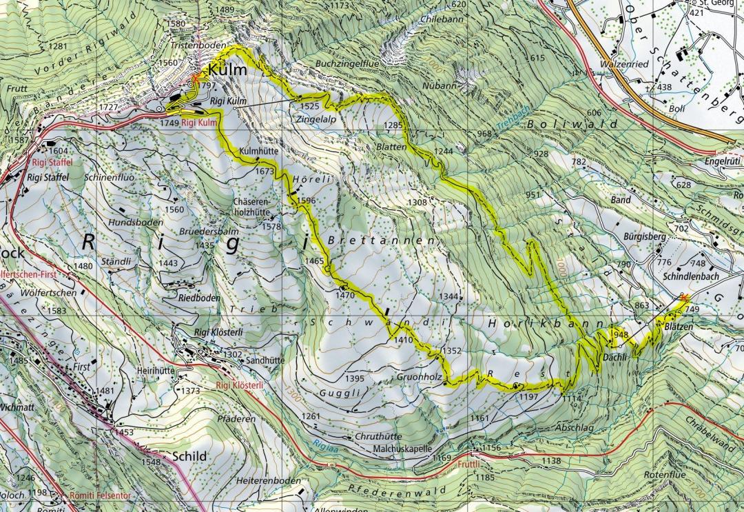 Goldau Schindlenbach(749m) - Dächli (948m) - Zingelalp (1525m) - Rigi Kulm (1797m) - Kulmhütte (1673m) - Schwändi Pt.1352 (1352m) - Dächli (948m) - Goldau Schindlenbach (749m)