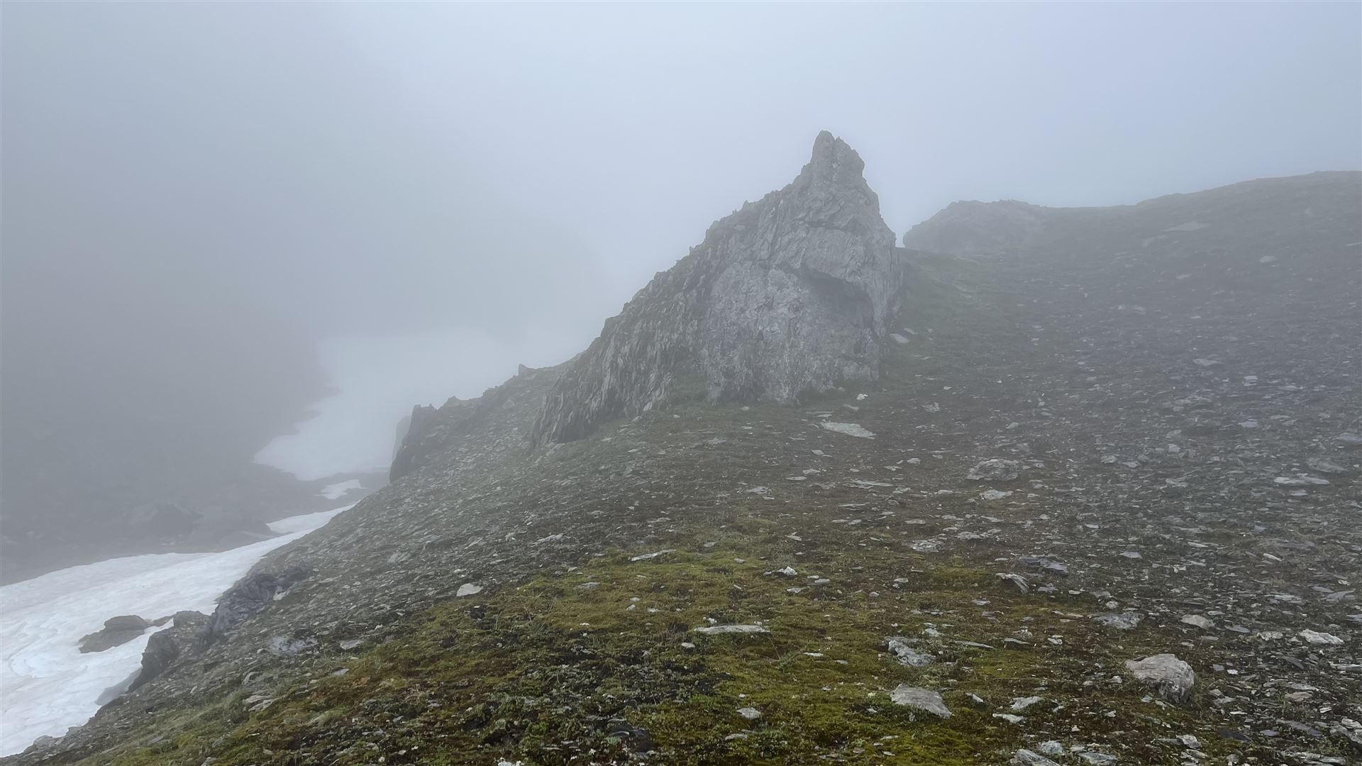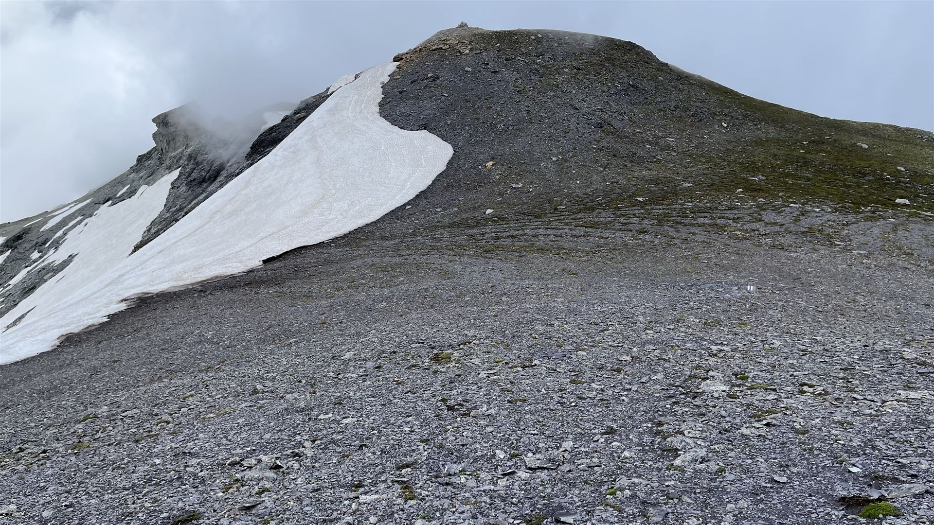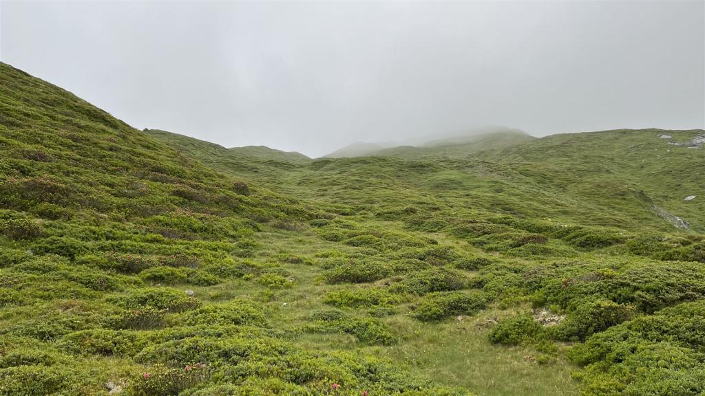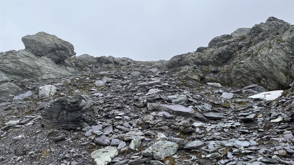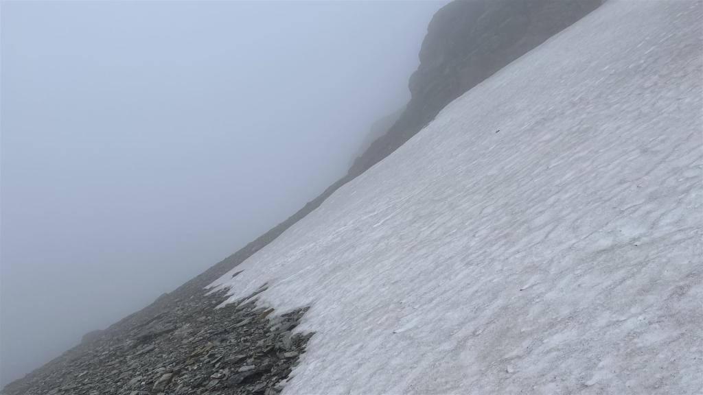 Ohne Sicht war auch der Aufstieg auf den Grat nicht einzusehen. Ich entschied mich, den vermeintlich einfachsten Aufstieg bei Crena Martin zu nehmen, was einen Umweg bedeutete.