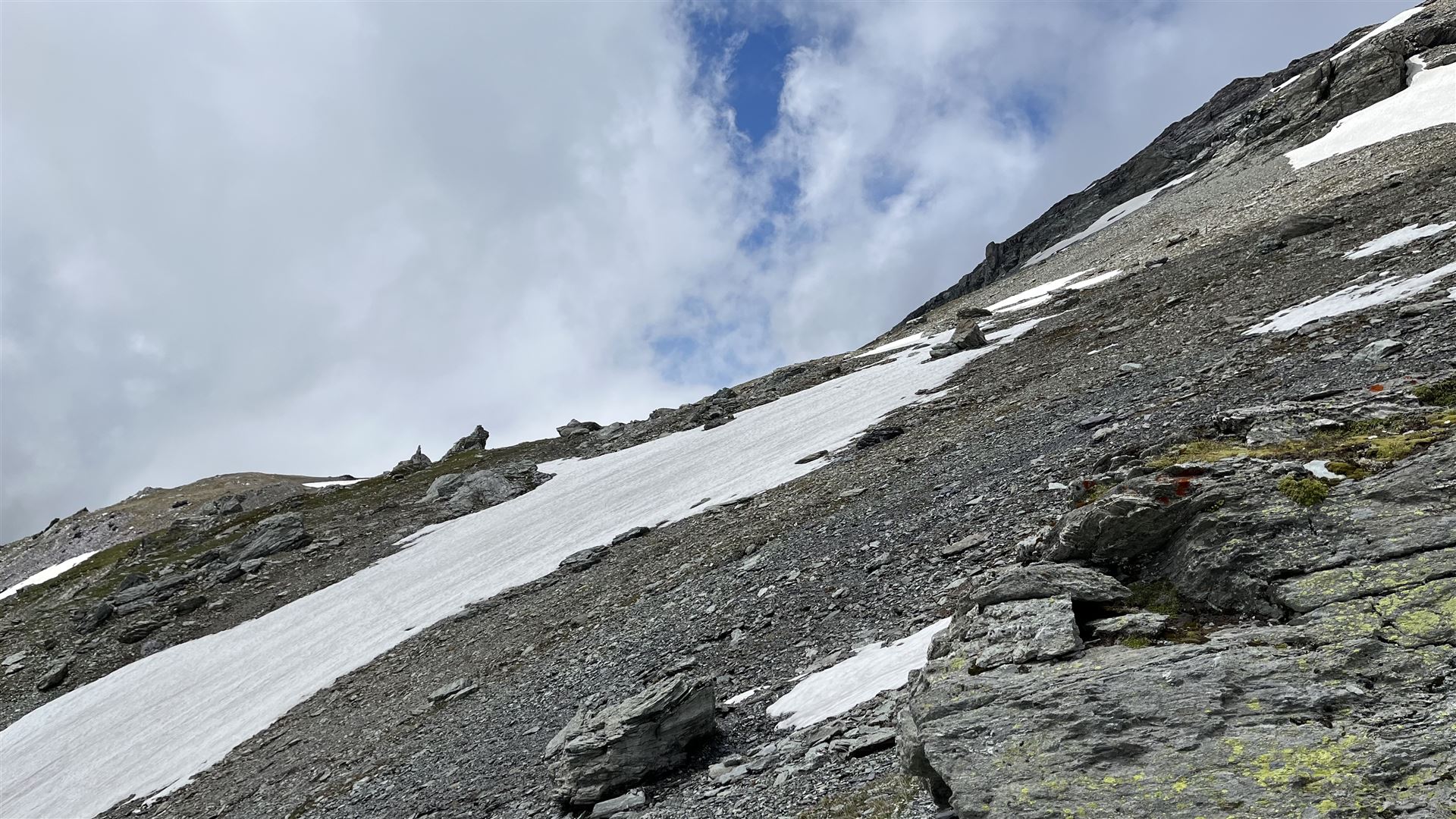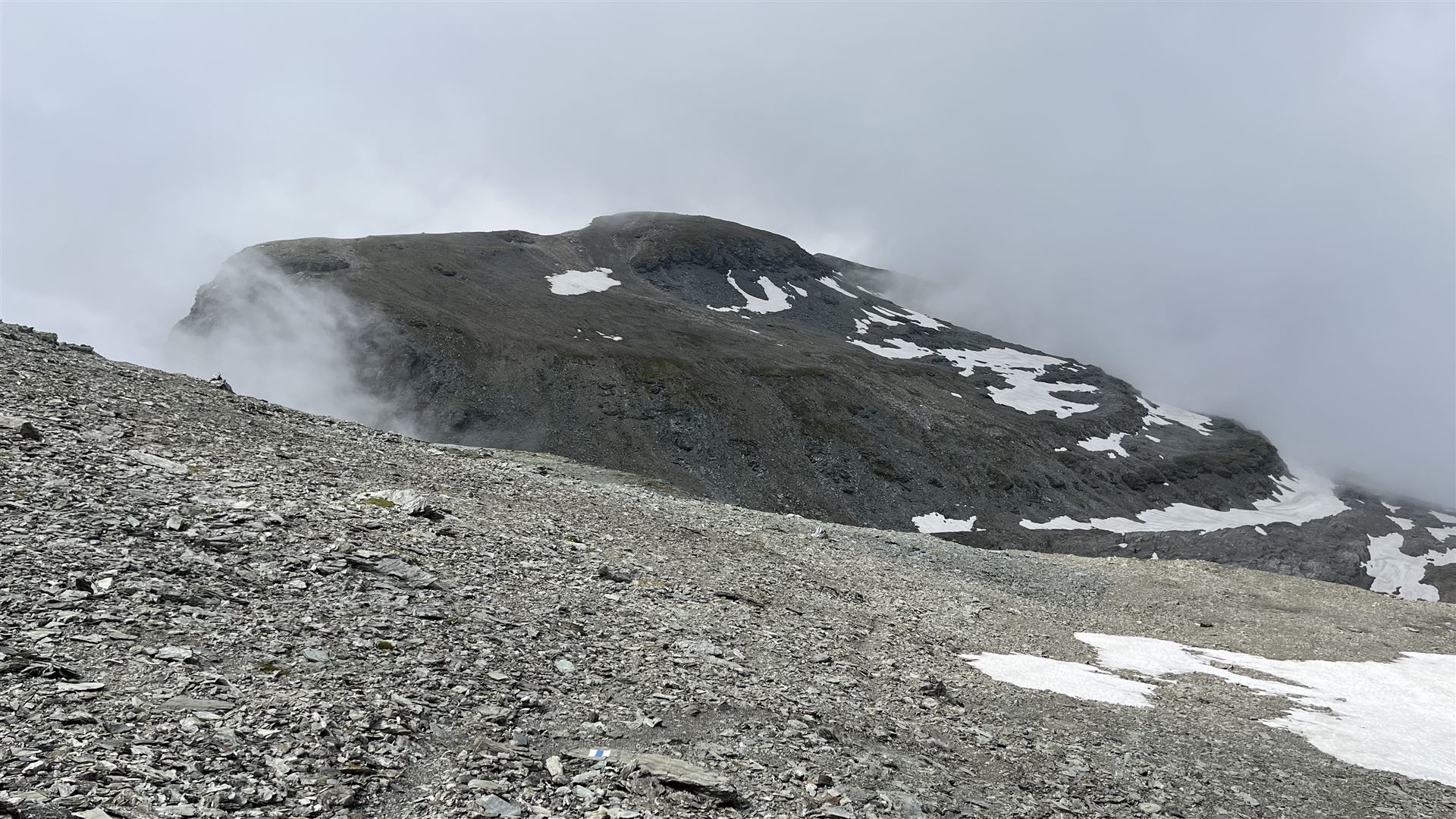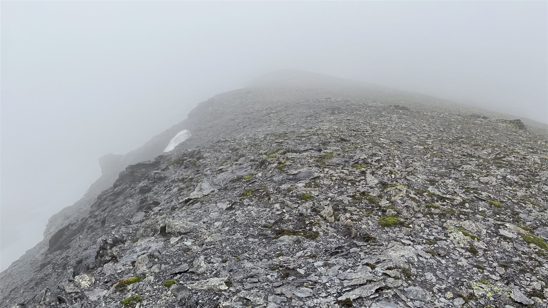 Ohne Sicht war auch der Aufstieg auf den Grat nicht einzusehen. Ich entschied mich, den vermeintlich einfachsten Aufstieg bei Crena Martin zu nehmen, was einen Umweg bedeutete.